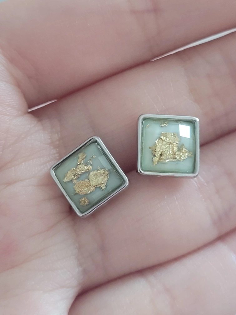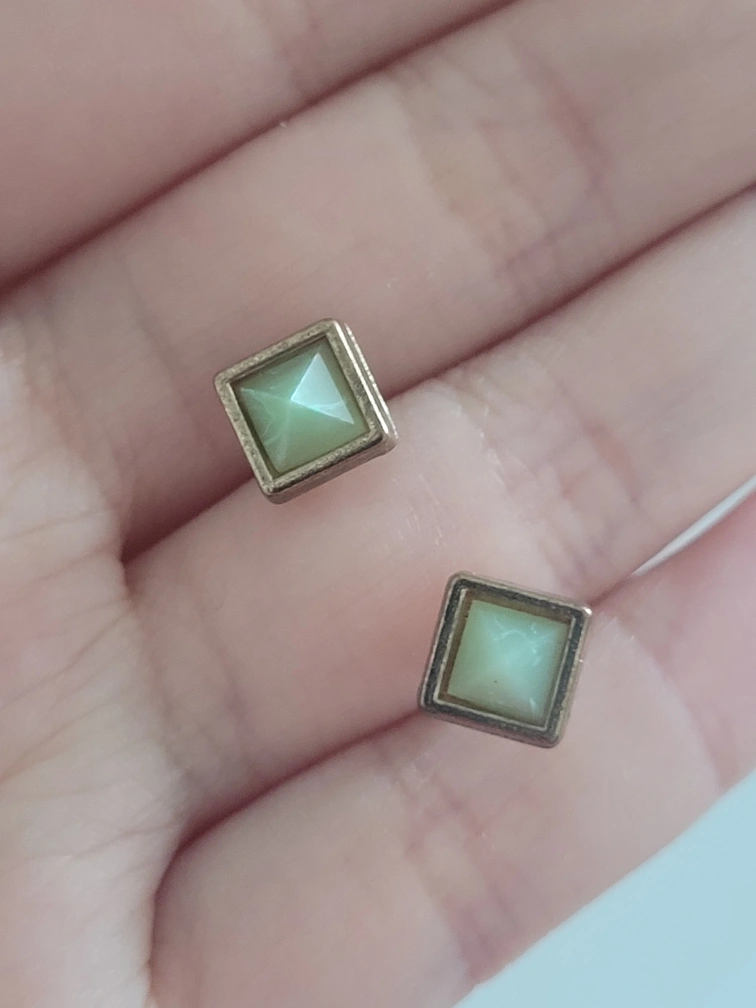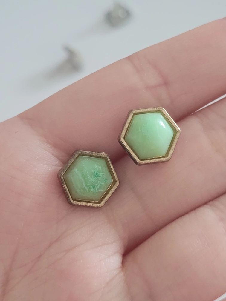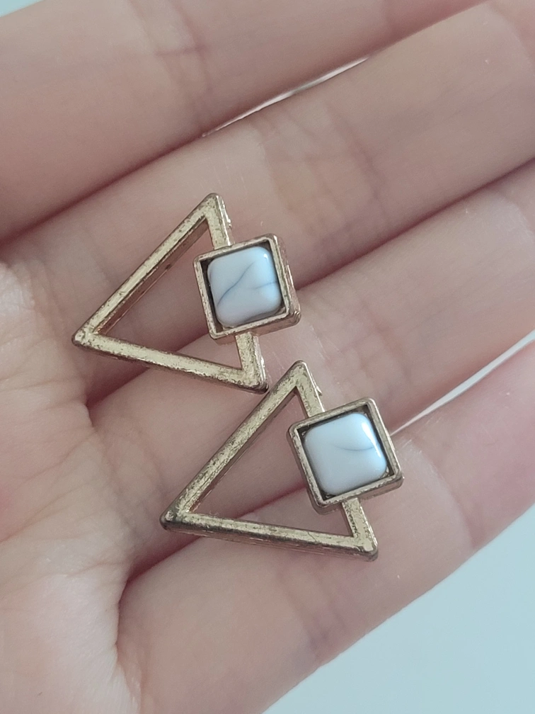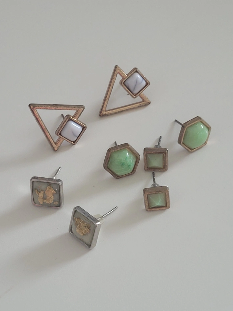 106Set of four pairs of earrings. Includes geometric designs, marble and green accents. Gold and silver-toned metal. Various shapes and colours. Can be bought separately.