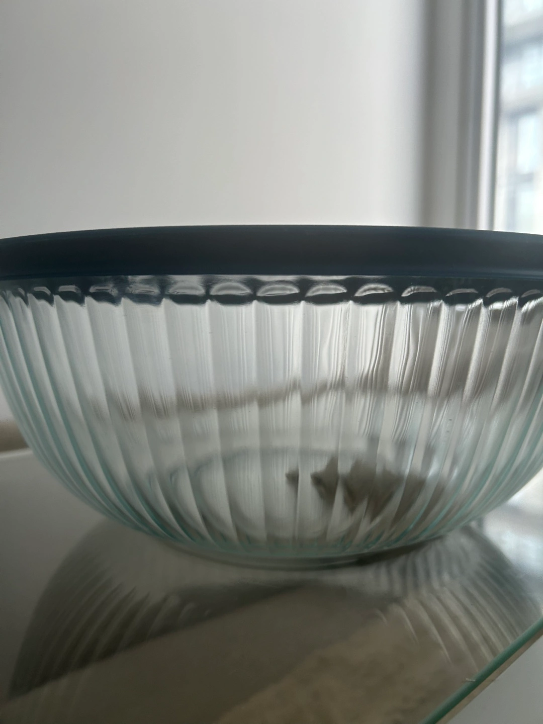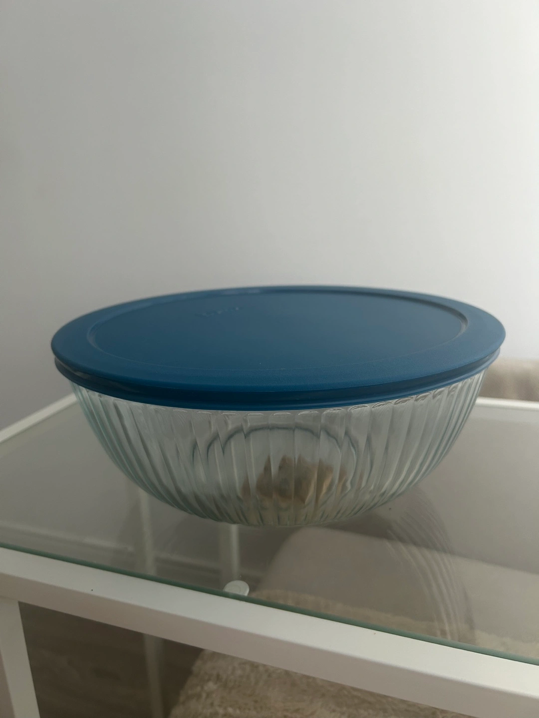 Large glass mixing bowl. Features a ribbed design and a blue plastic lid. Perfect for mixing ingredients or storing leftovers.