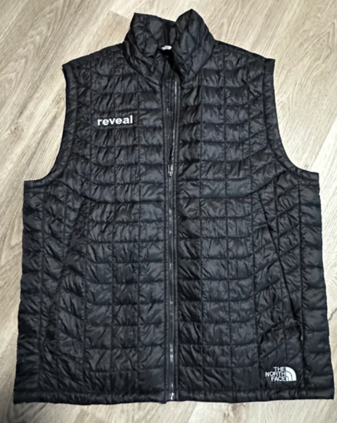 Men's black quilted vest. Features a zipper closure and the Reveal logo embroidered on the left breast. Good condition. The North Face branding visible. Only 1 time wear
