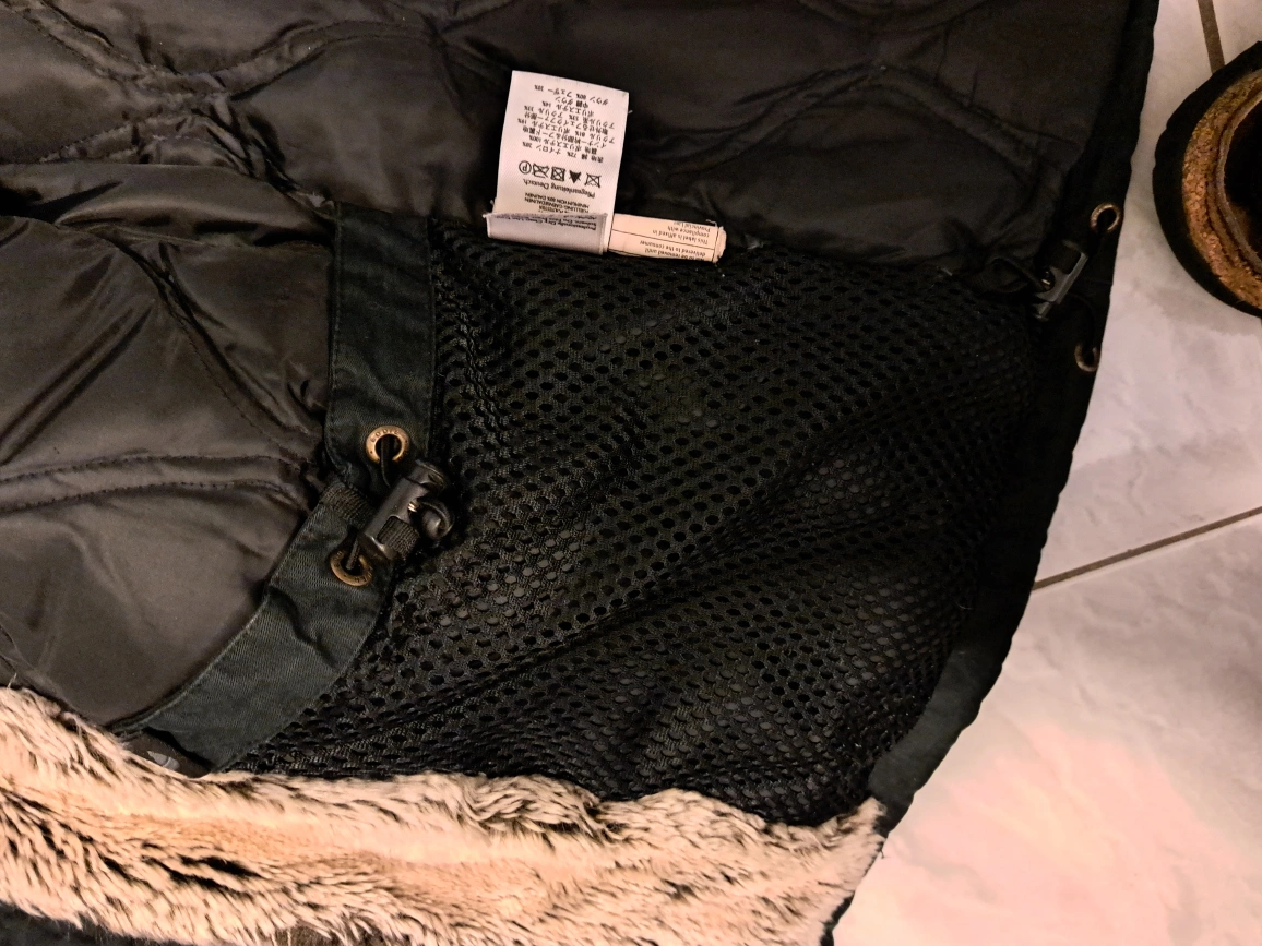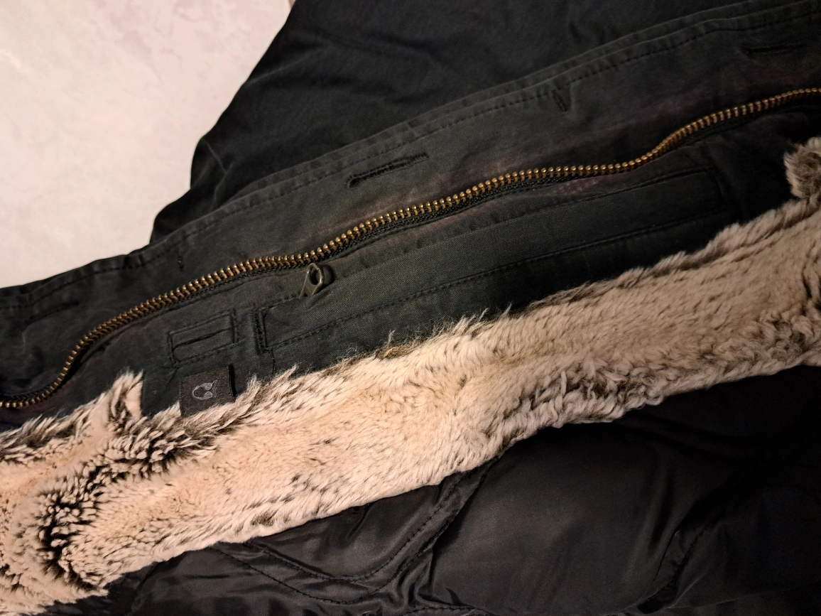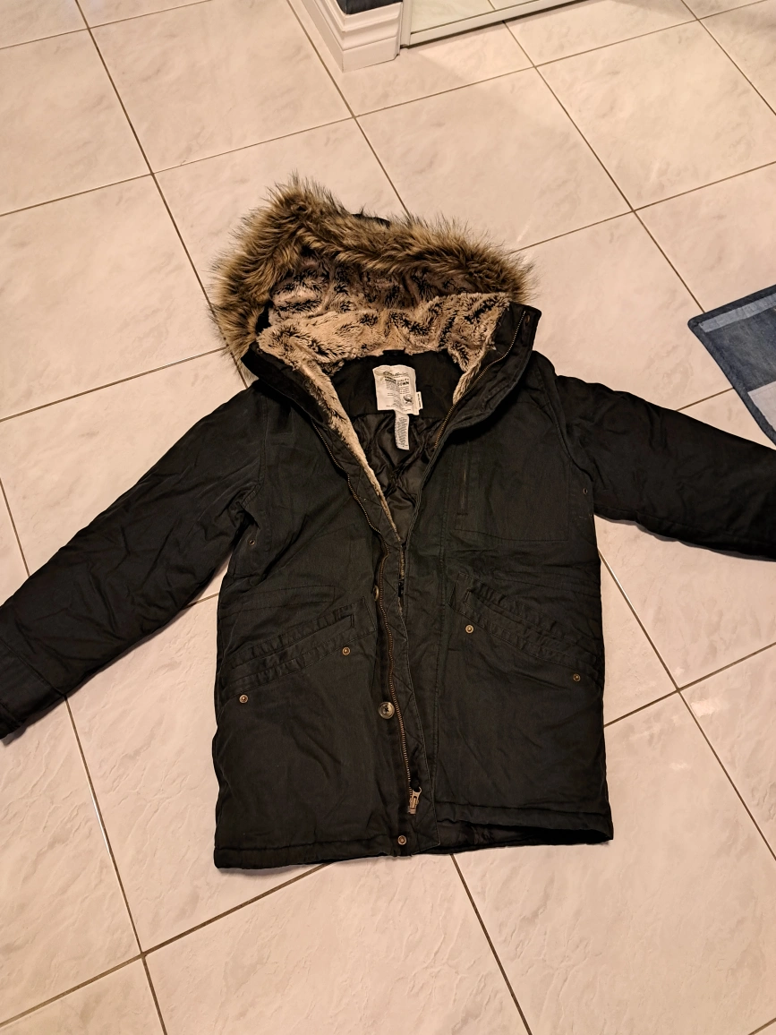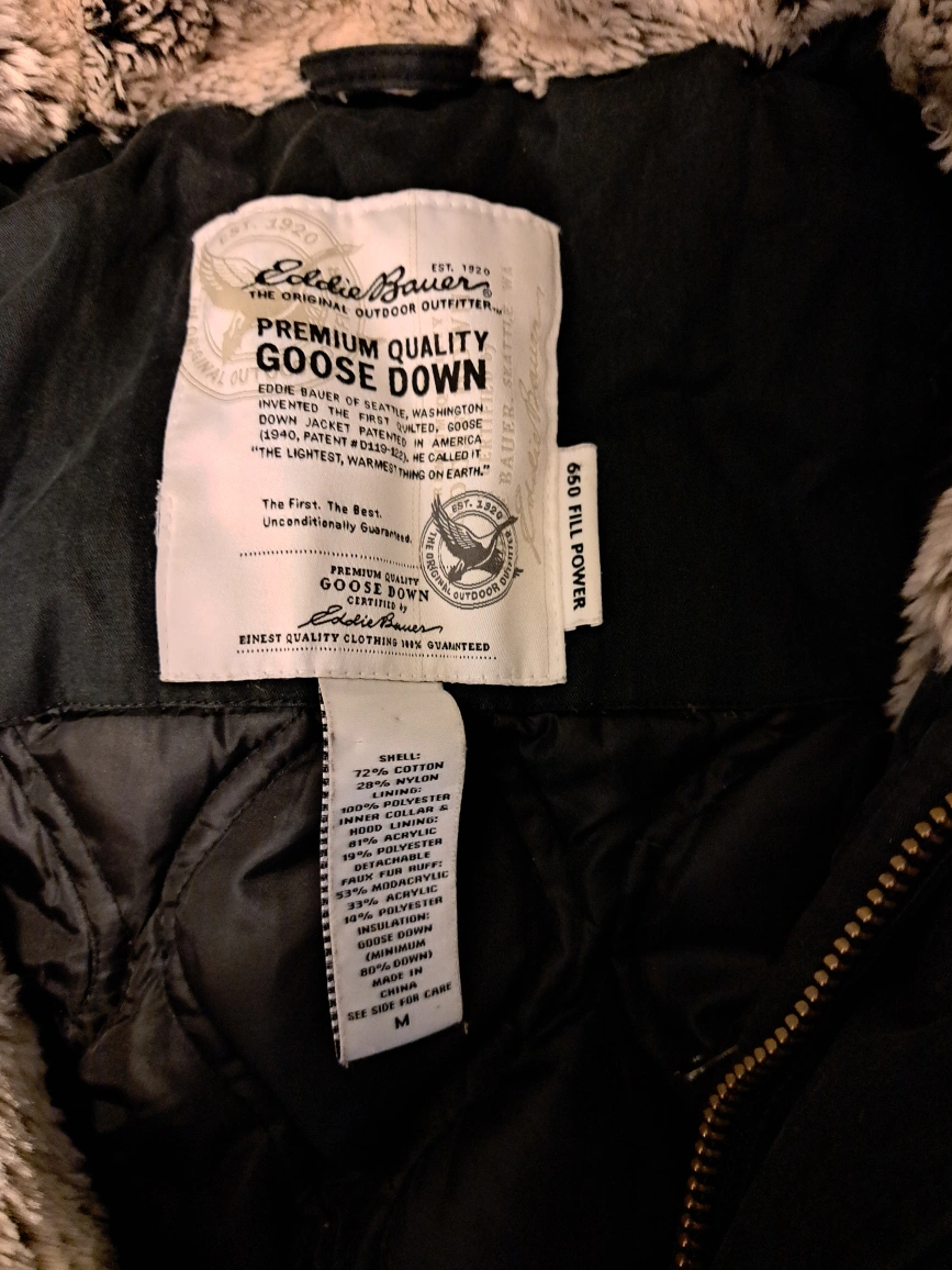 Men's Eddie Bauer parka. Size medium. Dark-coloured outer shell. Features a faux fur-lined hood. 650 fill power goose down. Multiple pockets inside and out. Warm winter jacket.