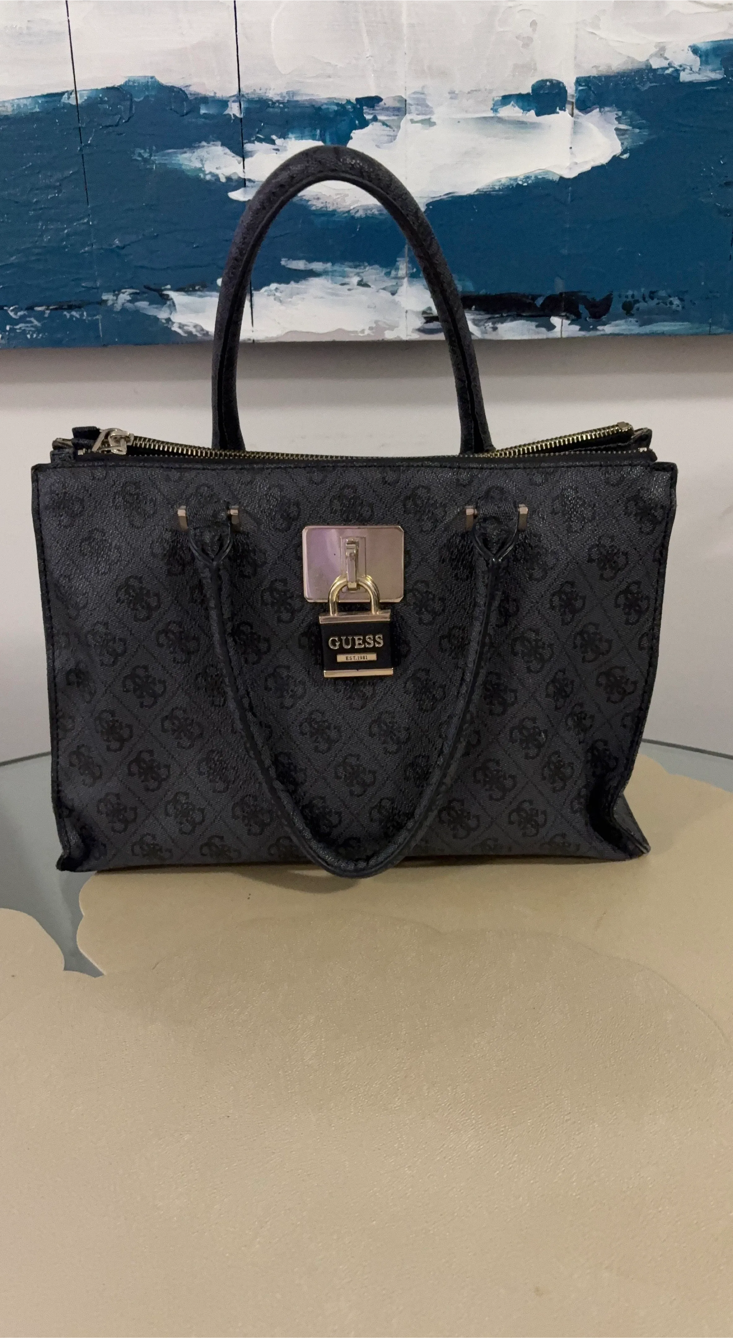 Selling a stylish Guess tote bag in black with a monogram pattern! It features a secure lock detail and is perfect for everyday use. This bag is in great condition and ready for a new owner!