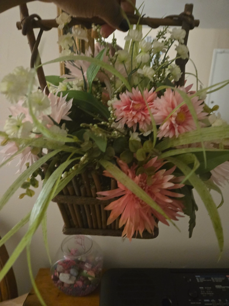 74Beautiful artificial flower arrangement. Pink and white flowers in a rustic wooden basket. Hanging design. Perfect for home decor.