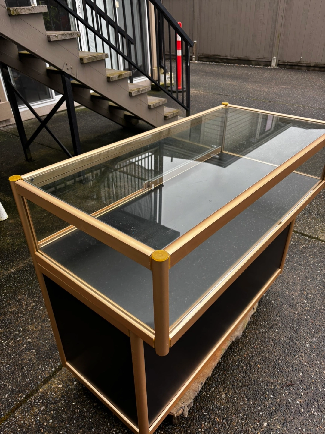 Two-tiered display case. Glass top and front. Black base and gold aluminum frame. Good for retail or collectibles.