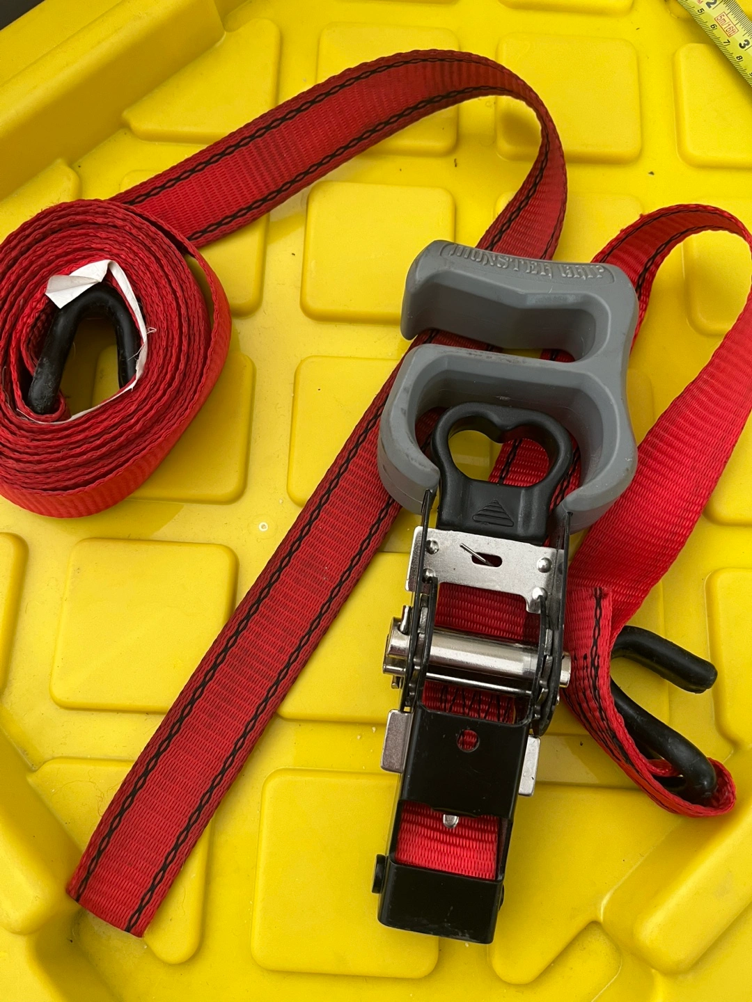 Heavy-duty ratchet strap. Red polyester webbing with black stitching. Grey cam buckle. Durable and reliable. Ideal for securing cargo.