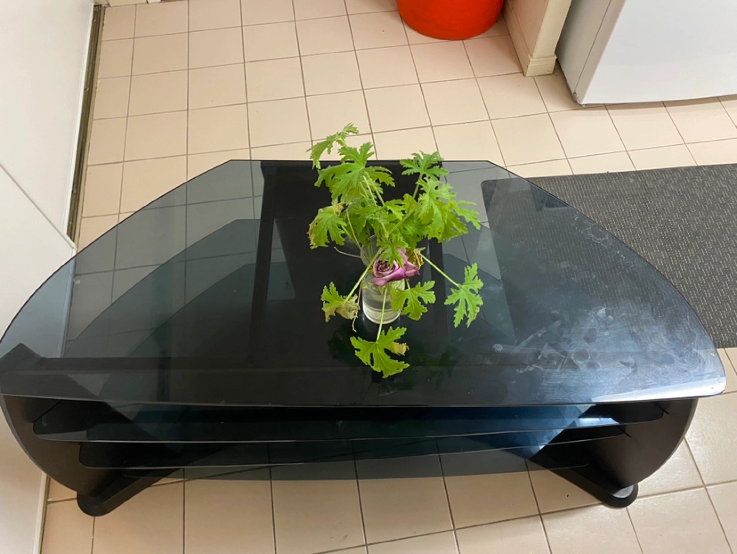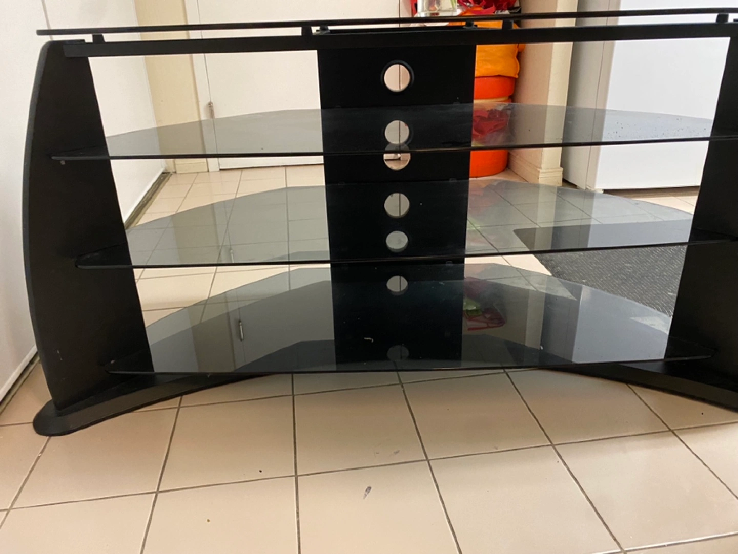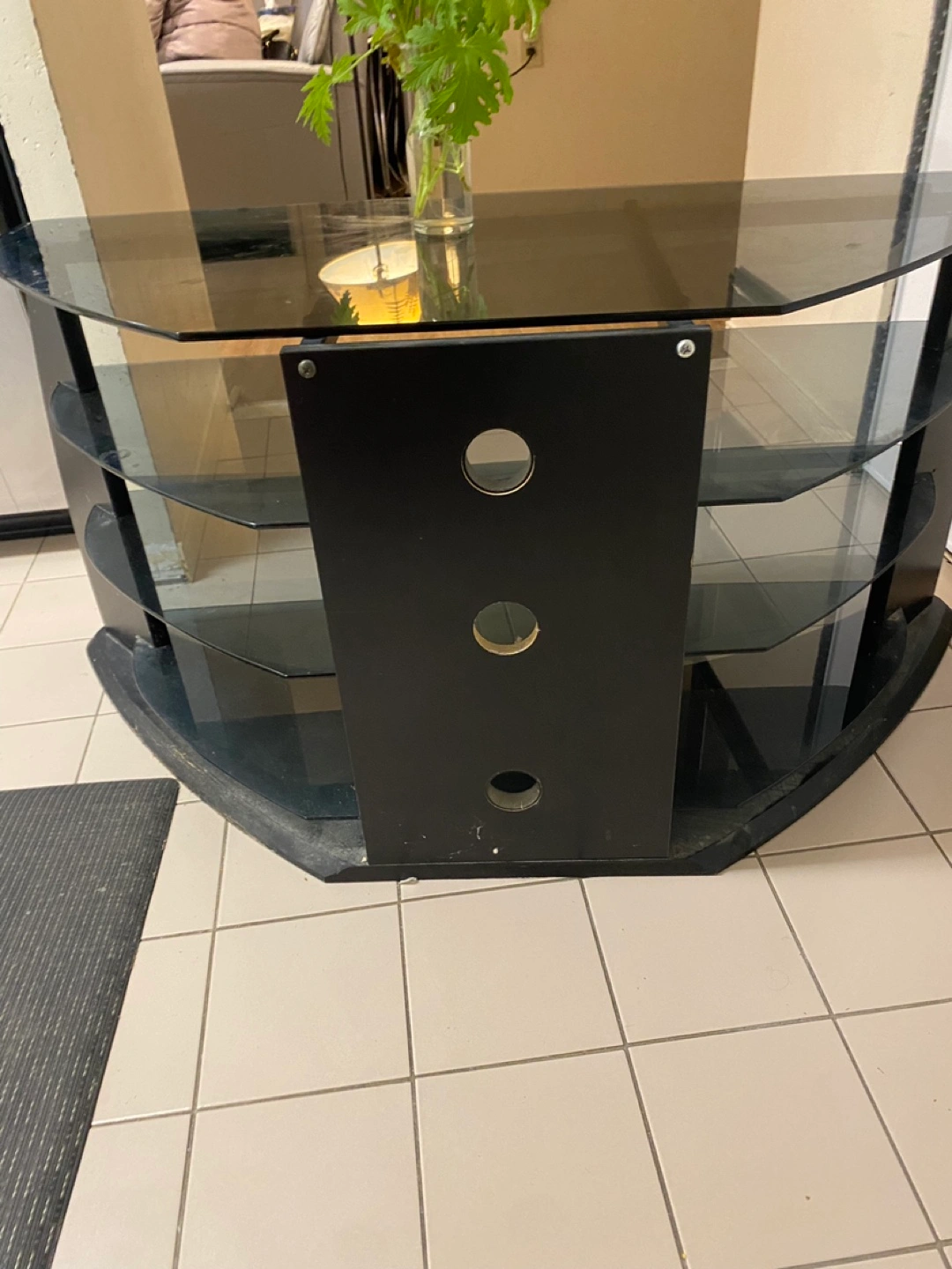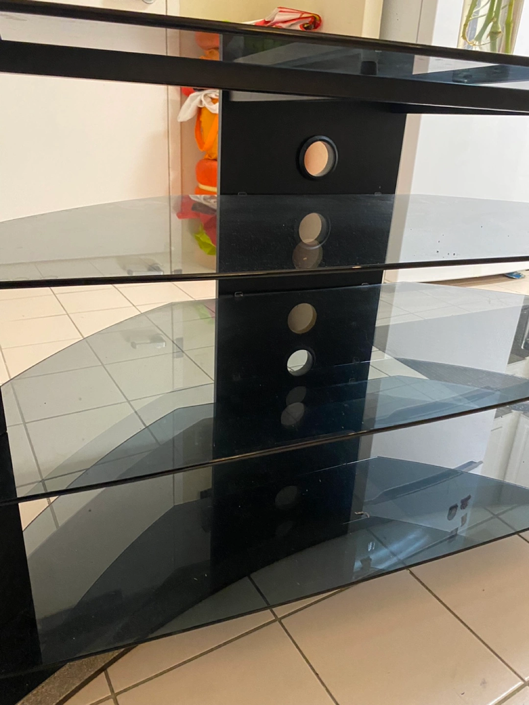 Corner TV stand. Black tempered glass shelves. Black wood frame. 4 shelves. Cable management holes. Good condition. Prices can be discussed
