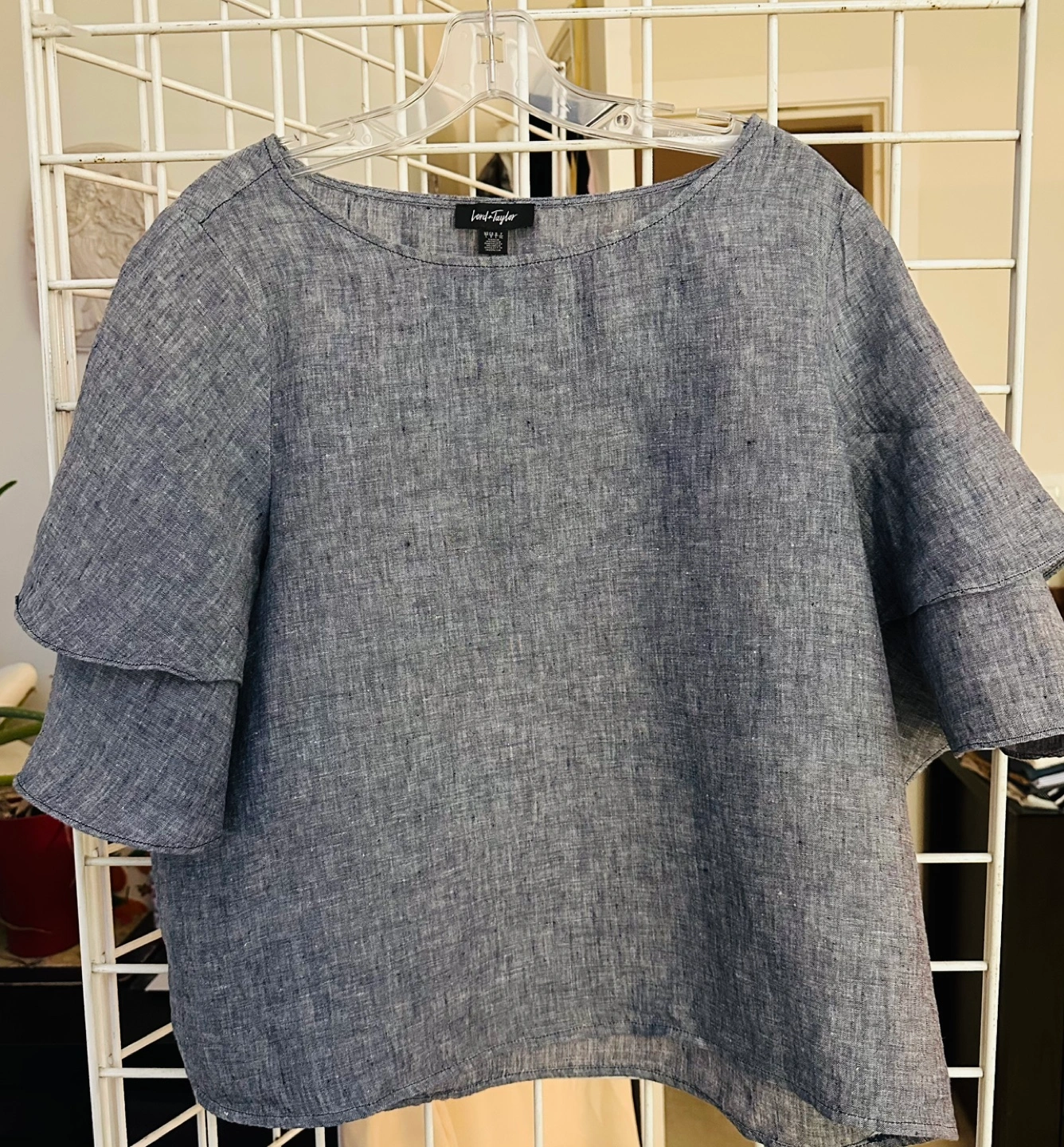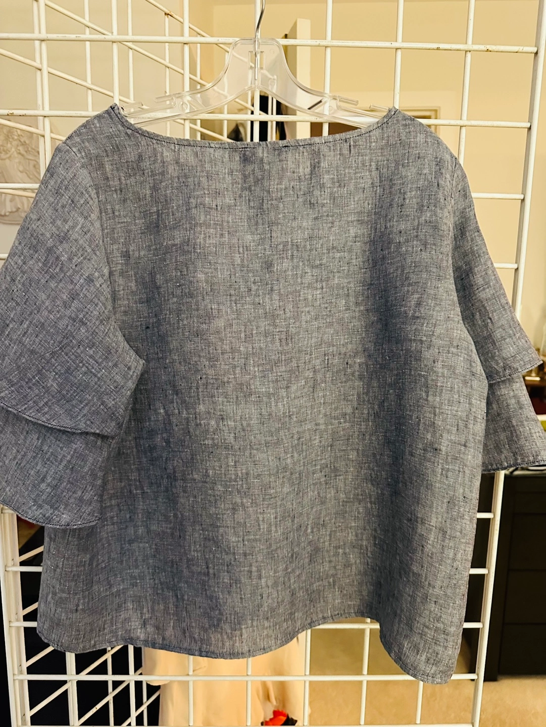 Blue linen blouse. Double ruffle sleeves. Relaxed fit. Size Large.