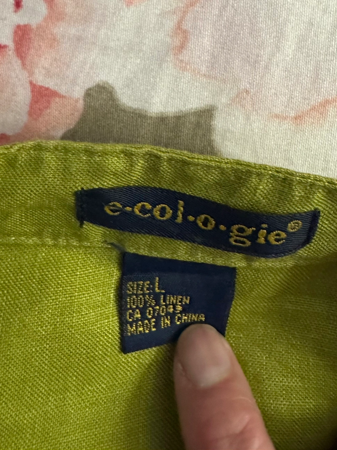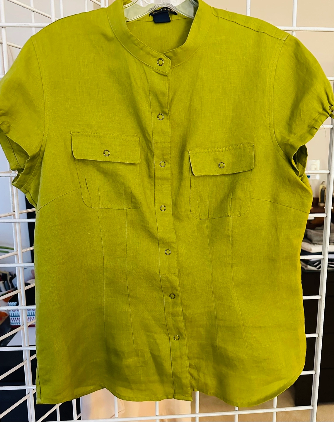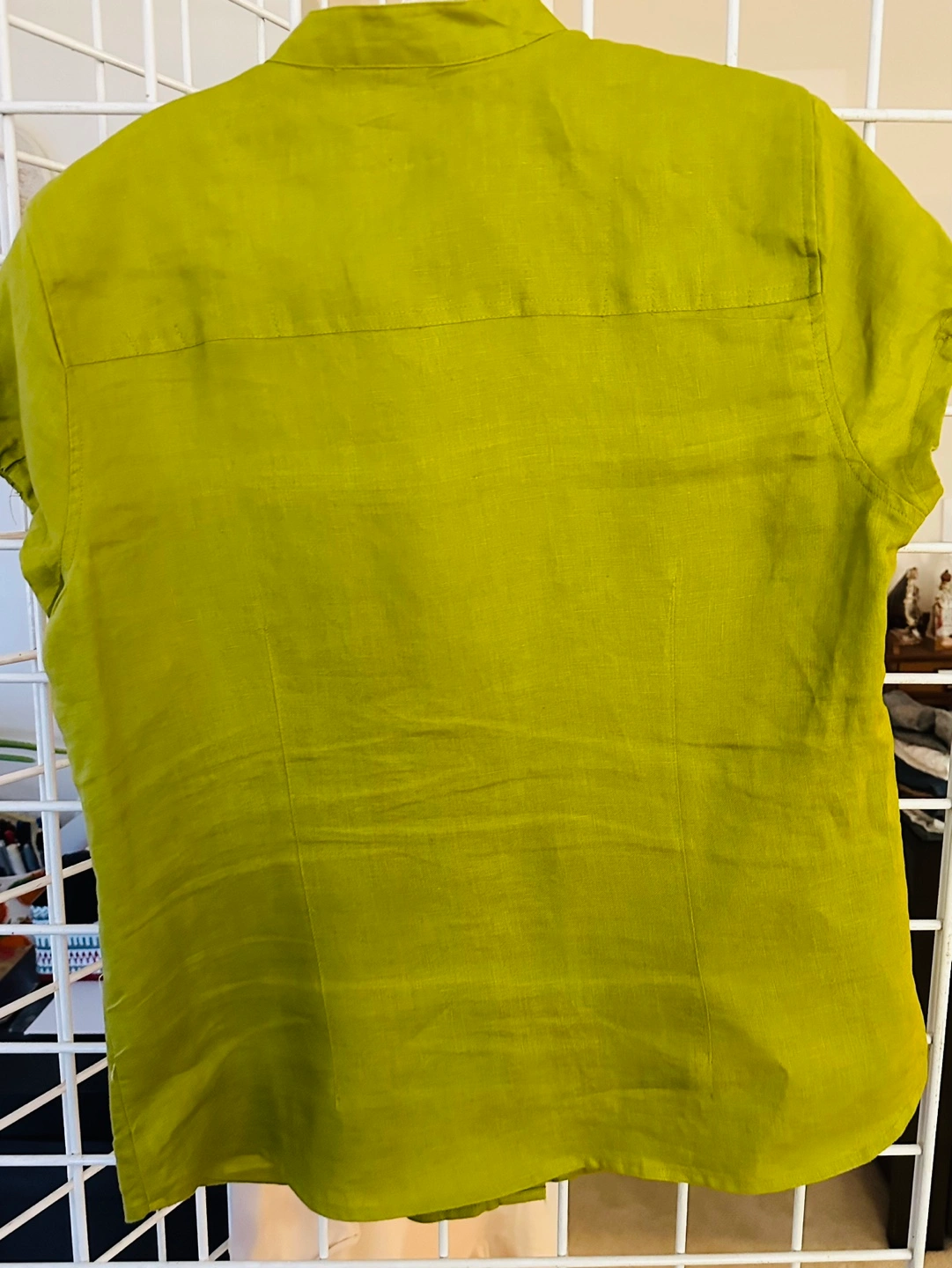 Olive green linen shirt. Size large. Short sleeves. Mandarin collar. Button front. Two chest pockets. Made in China.