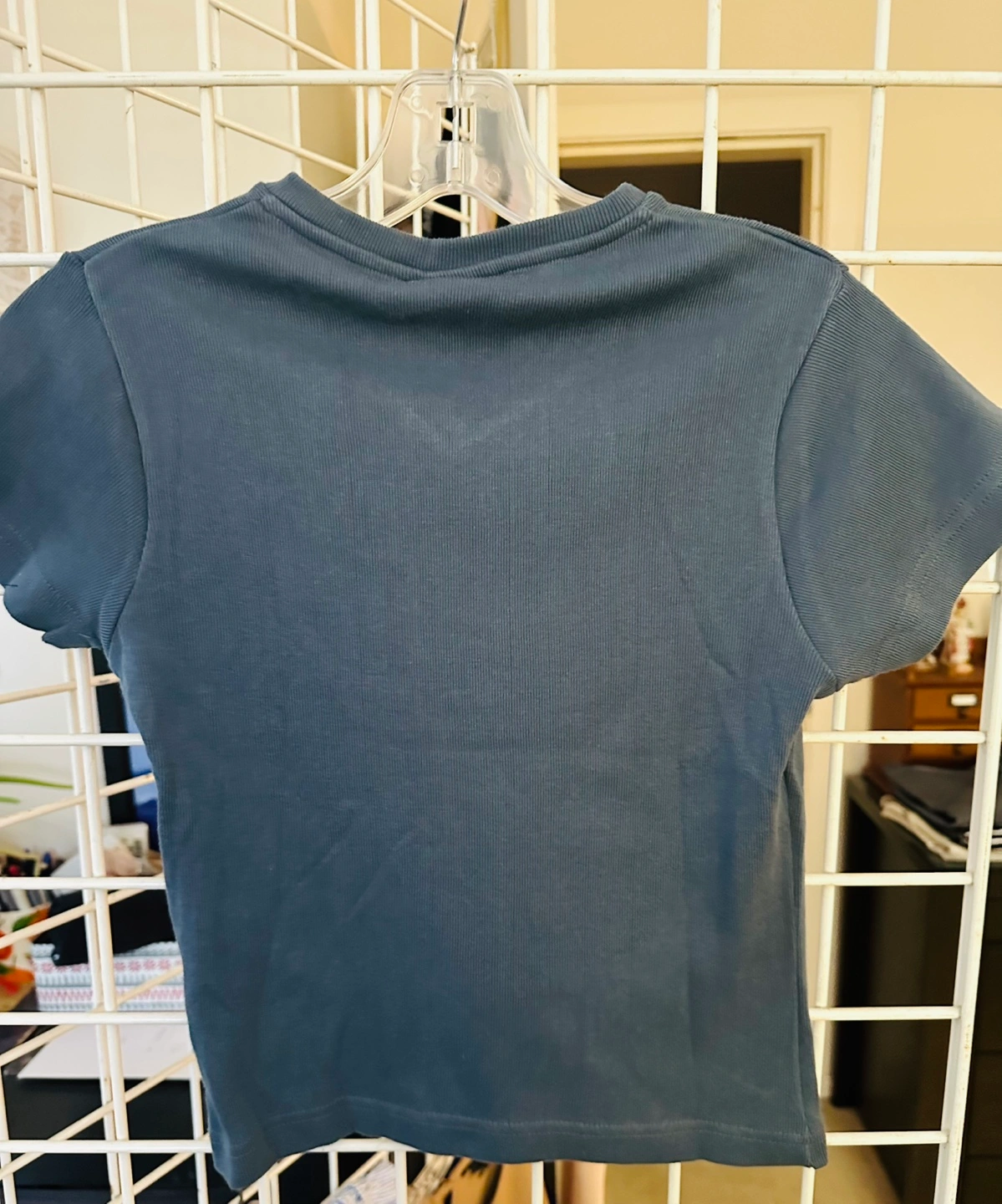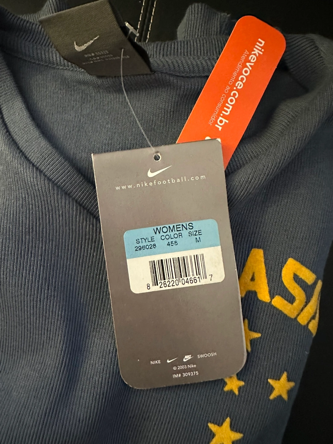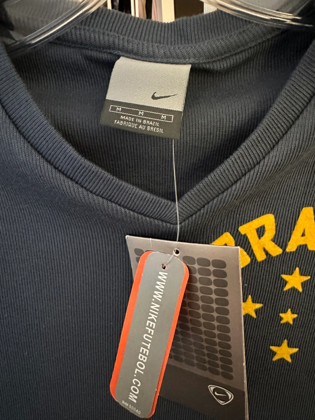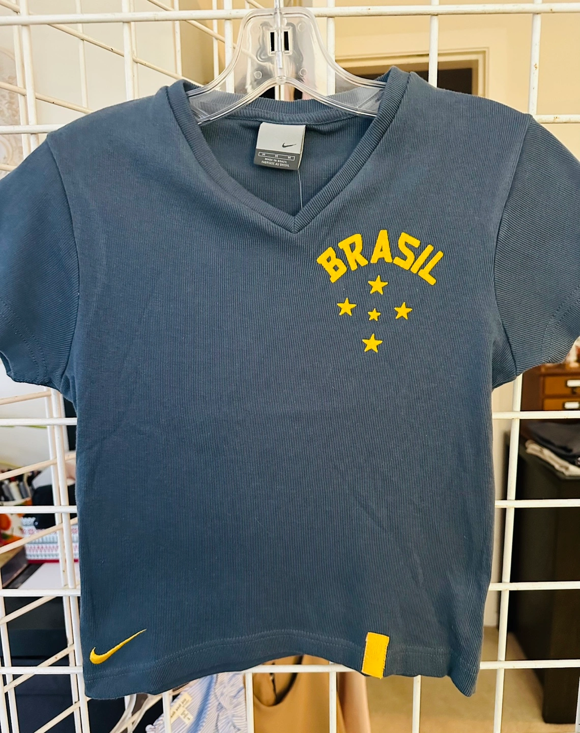 Short sleeve ribbed V-neck shirt. Features the word Brasil and five stars. Made in Brazil. Size Medium. Fits small