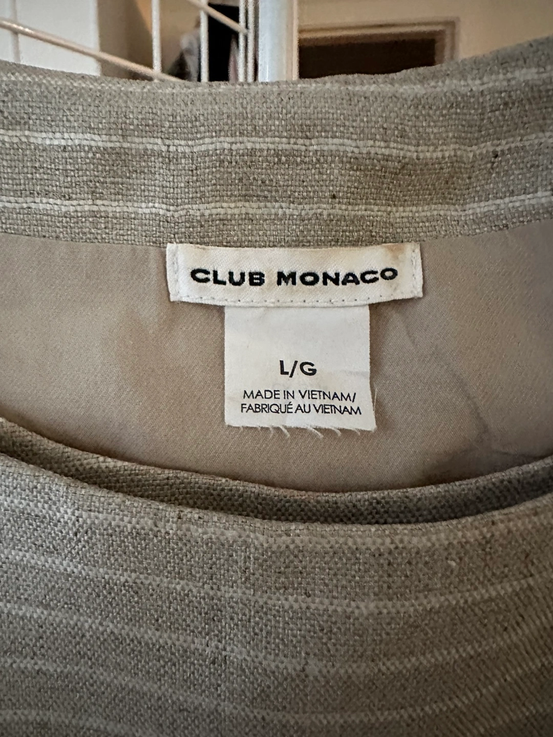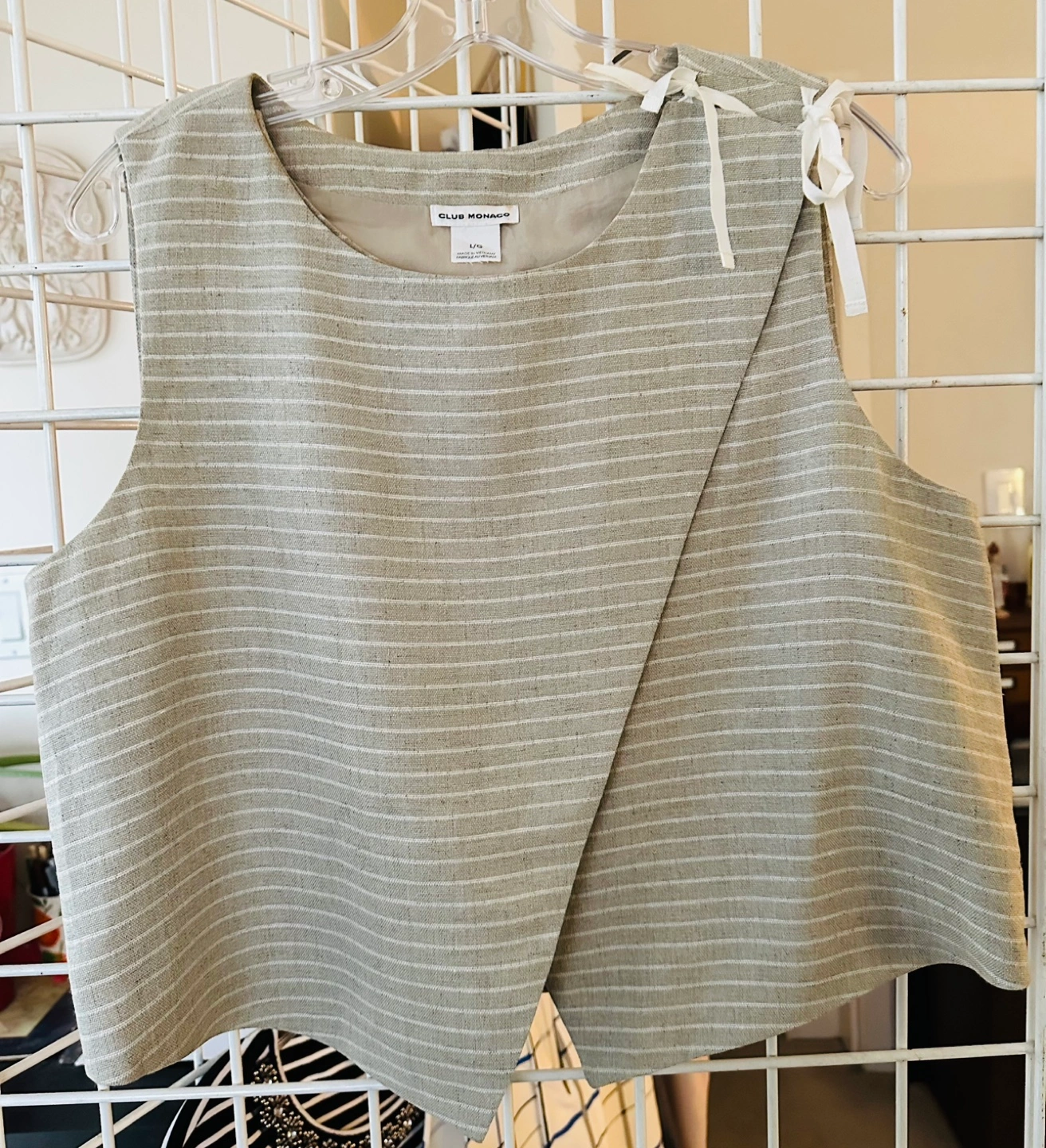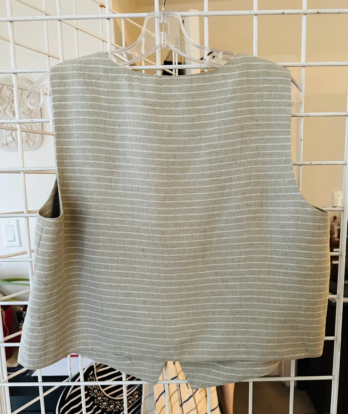 Linen vest. Pale beige with thin white stripes. Asymmetrical hem. Size L/G. Made in Vietnam.