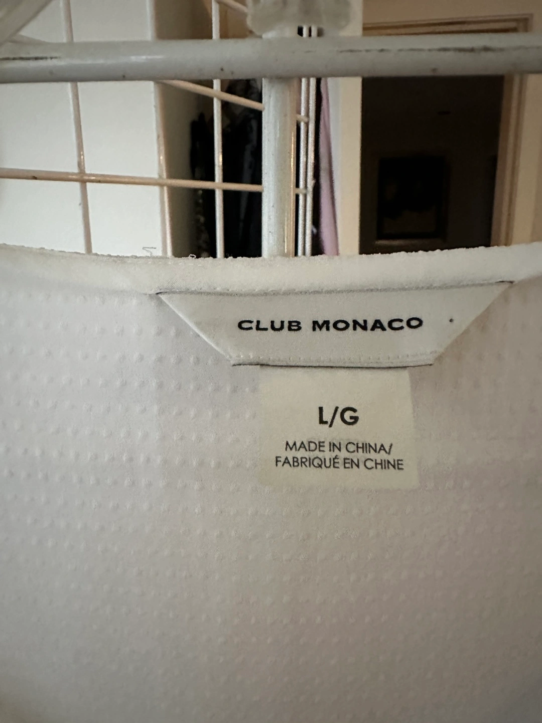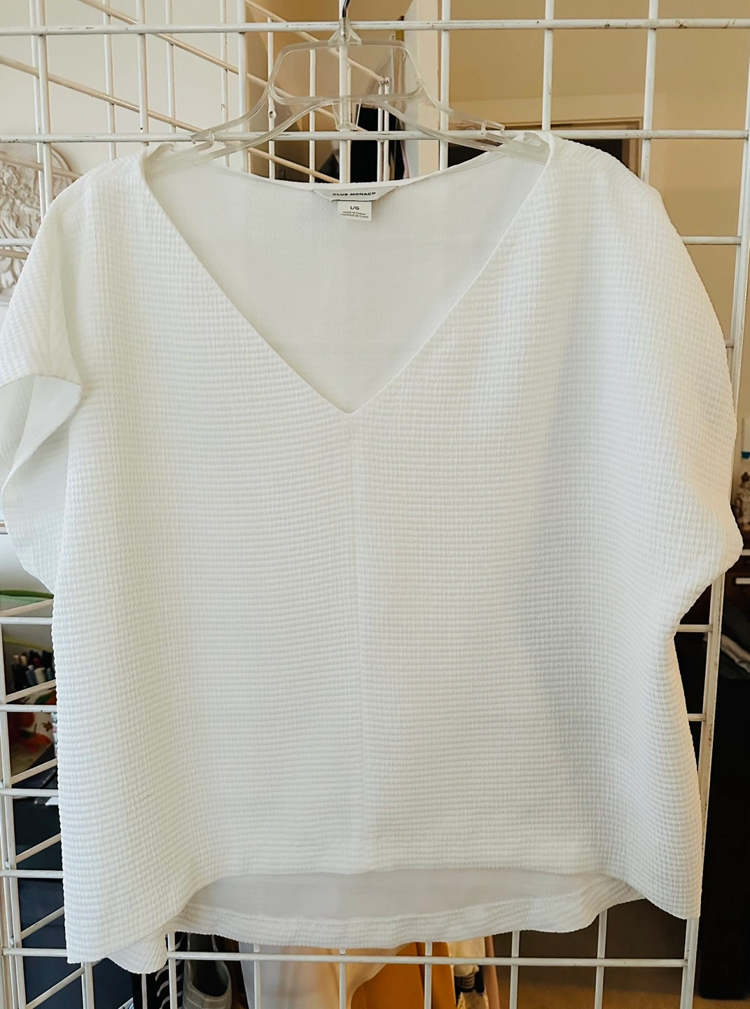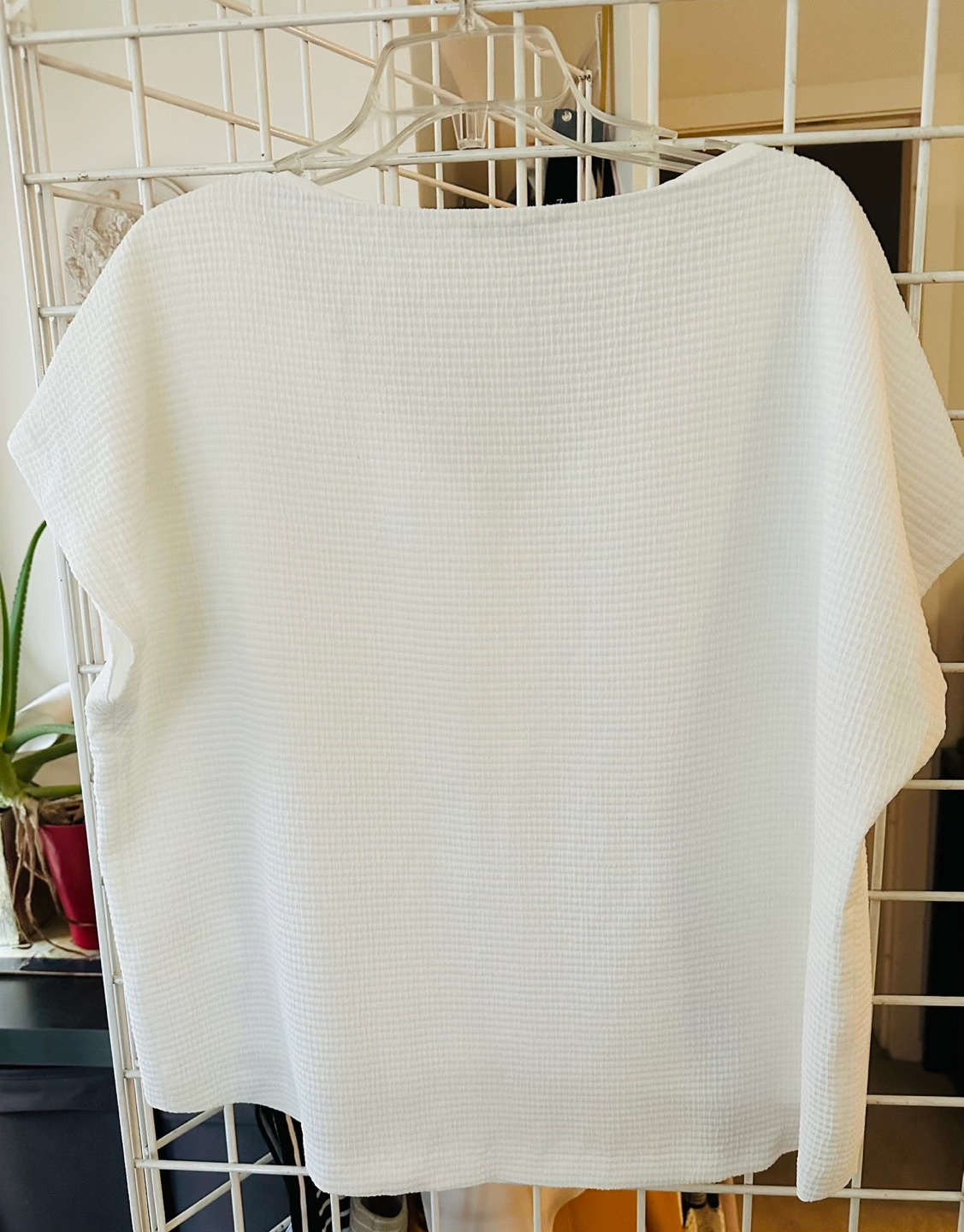 Boxy, short-sleeved top. Waffle knit texture. V-neck. Relaxed fit. Size large.