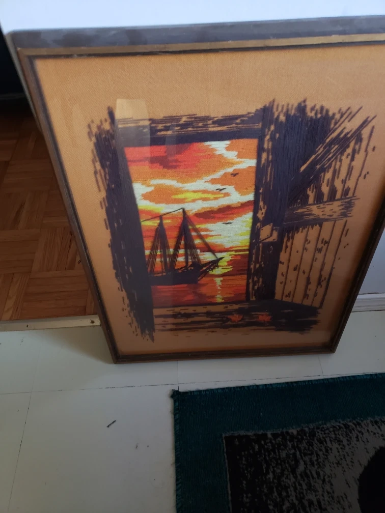 Beautiful vintage needlepoint artwork. Depicts a sunset scene viewed from an open doorway. Framed in a dark wood frame. Perfect for a nautical-themed room.