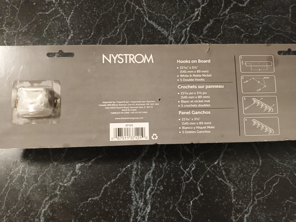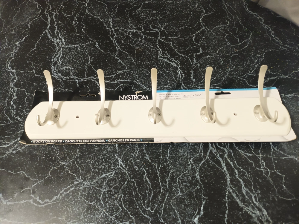 New in package. White board with five matte nickel hooks. Great for entryway or closet.
