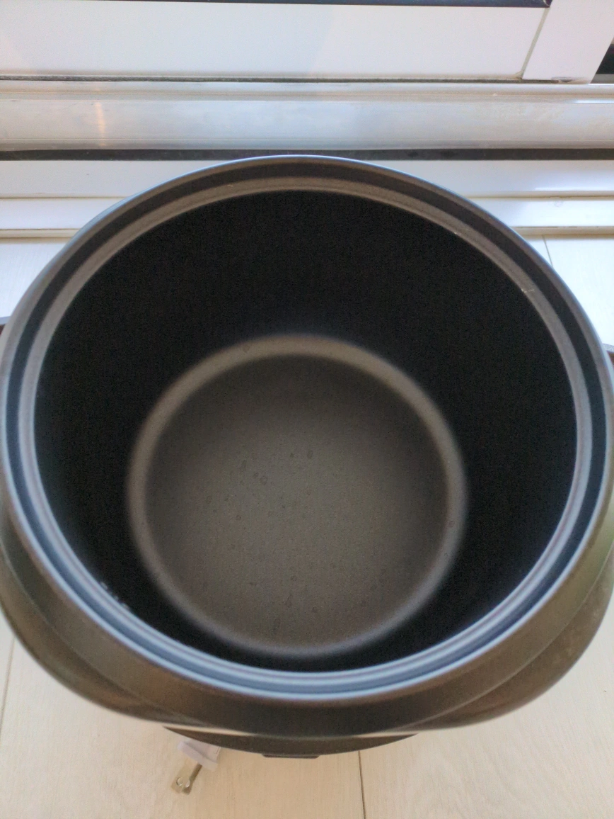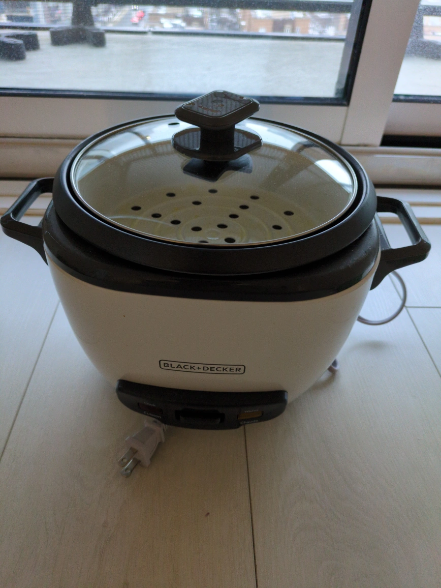 White rice cooker with black accents. Features a glass lid and steaming basket. Includes a power cord. Used condition.