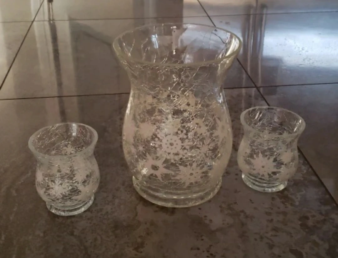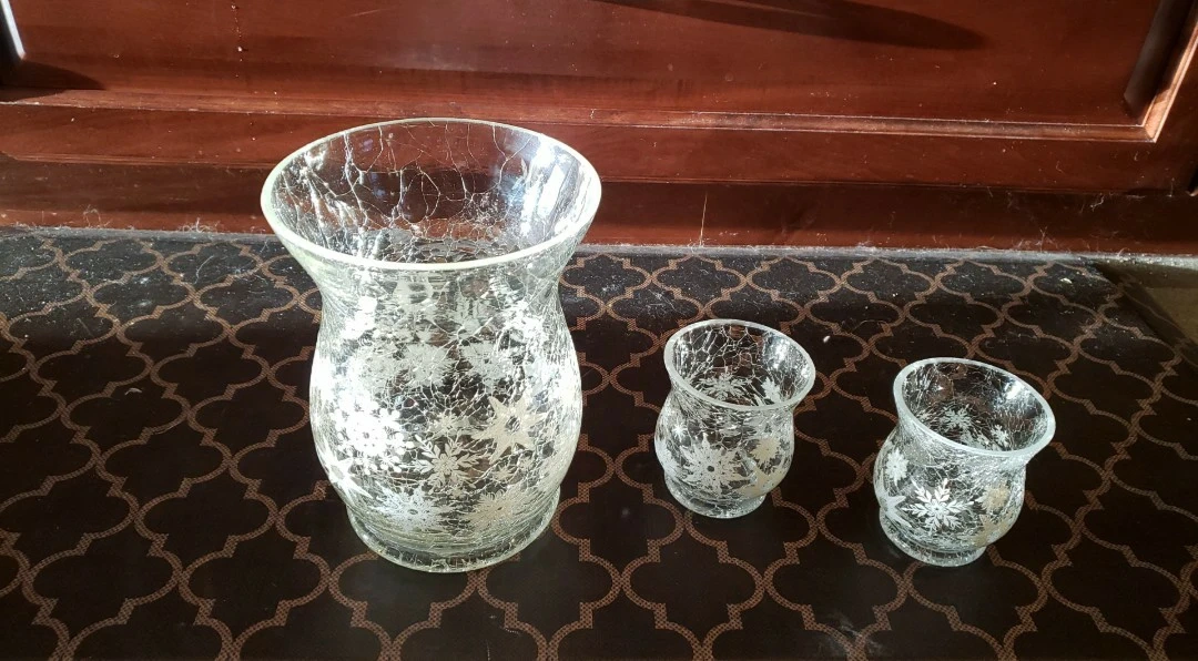 Set of three crackle glass hurricane vases.$15 for all 3