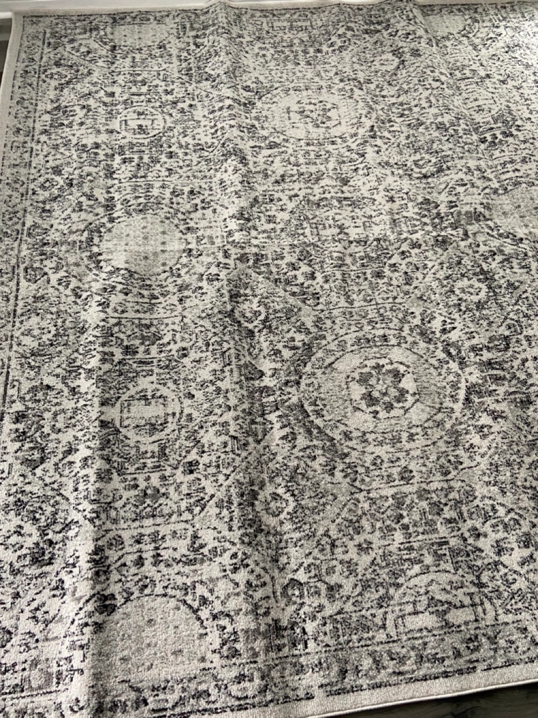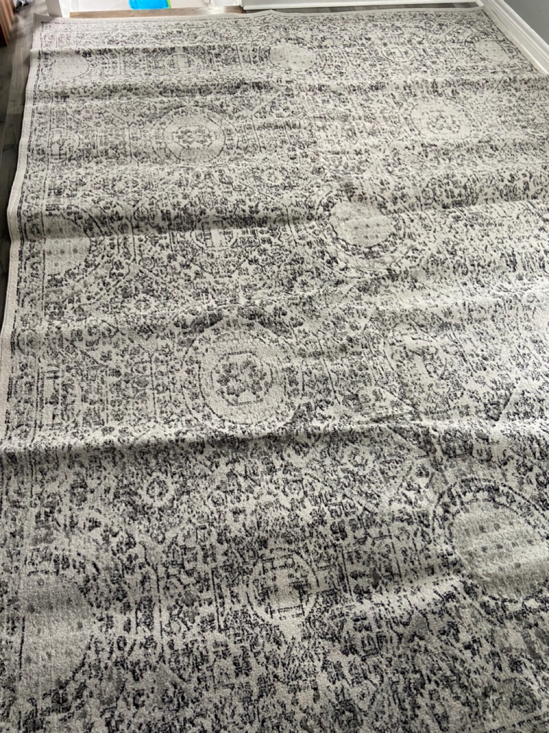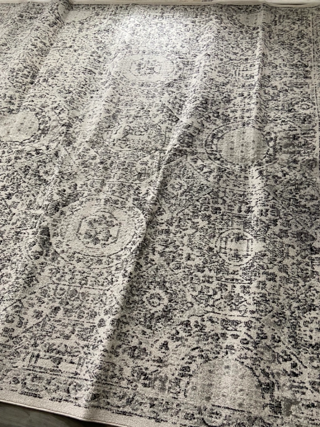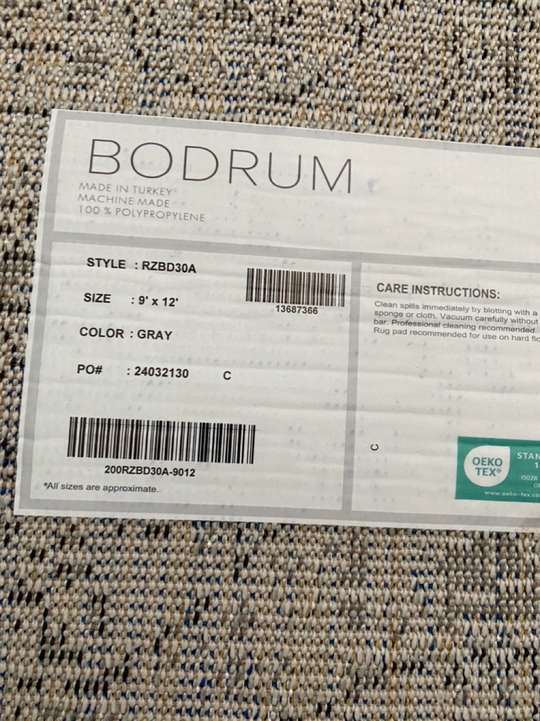 Large gray area rug. Machine-made in Turkey. 100% Polypropylene. Style: RZBD30A. Features an intricate pattern.