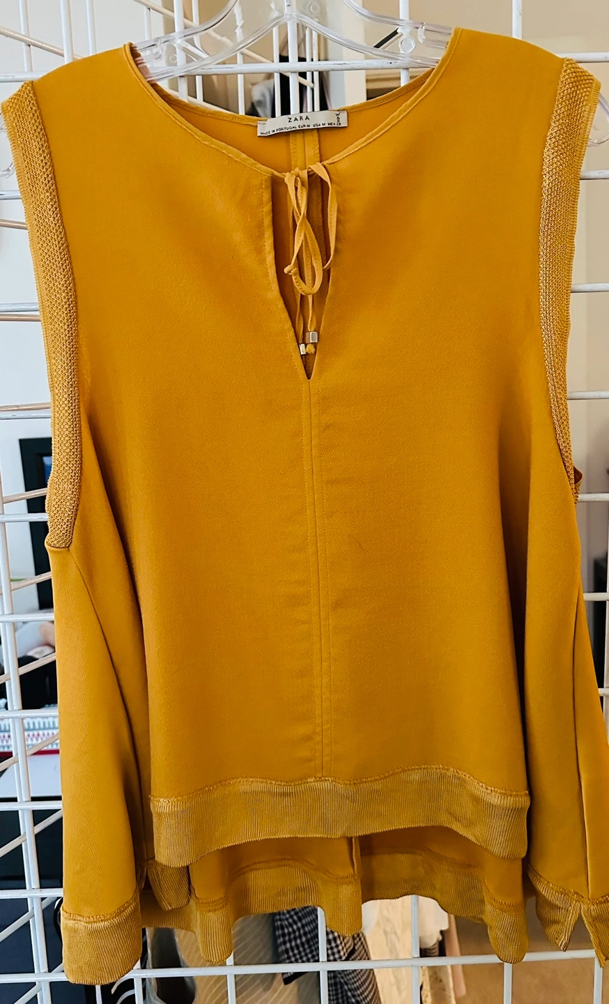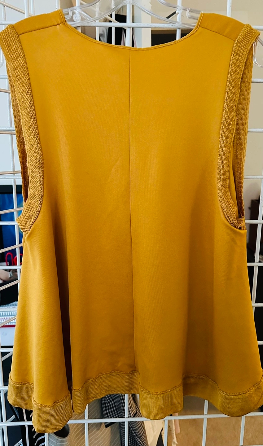 Beautiful mustard yellow sleeveless top. Size medium. Features a keyhole neckline with a tie detail. Ribbed detailing at the armholes and hem. Made in Portugal.