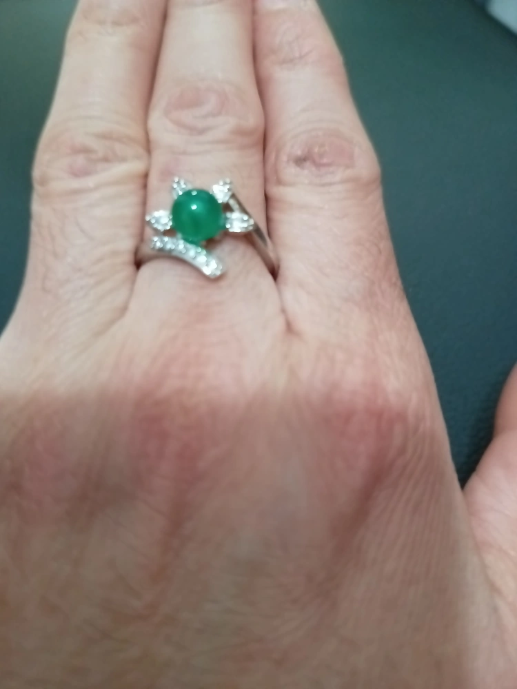 Silver-toned ring. Features a vibrant green stone. Small clear stones accent the design. Simple and stylish.