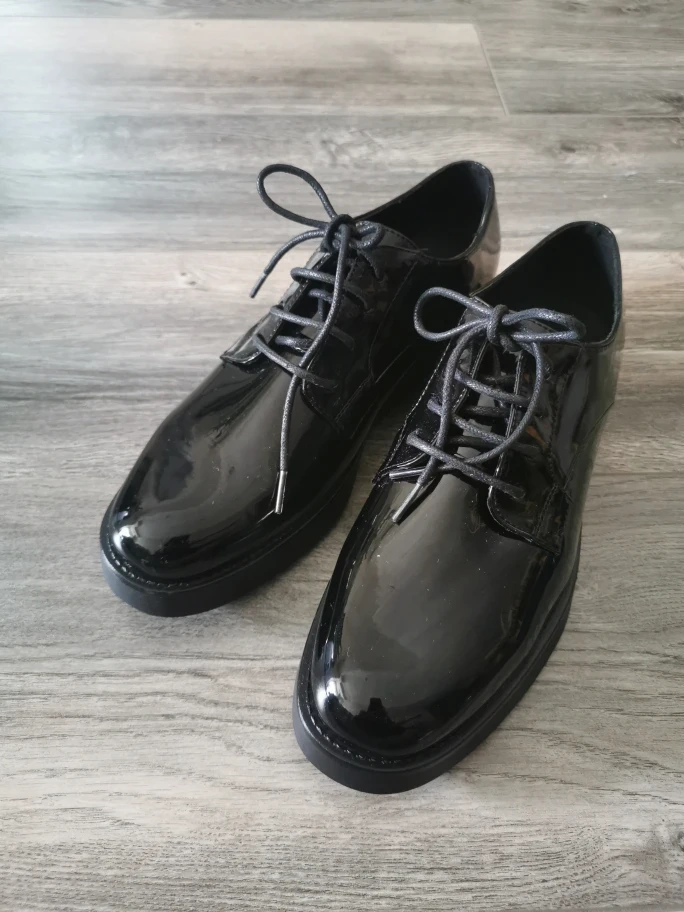 Women's black patent leather Oxford shoes. Lace-up design. Platform sole. Vegan. Size 39.