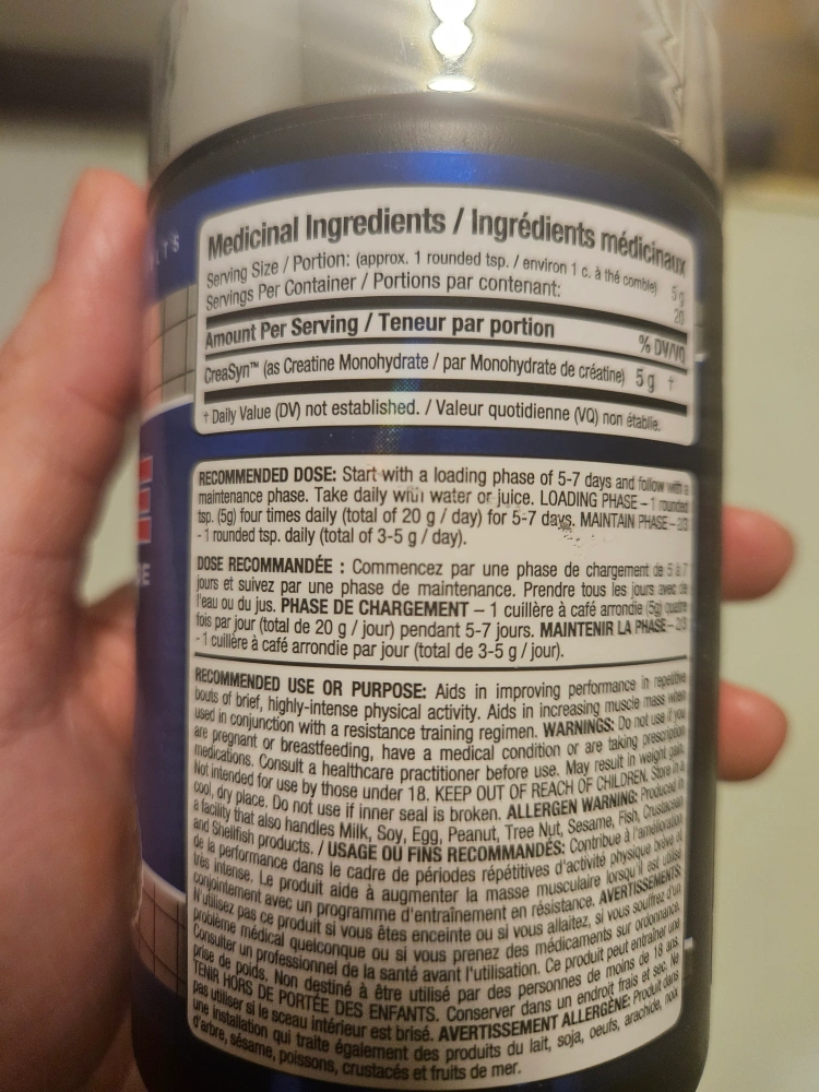 Creatine powder. Improves performance in high-intensity strength and power activities. Increases muscle mass, strength and size. Nearly full container.
