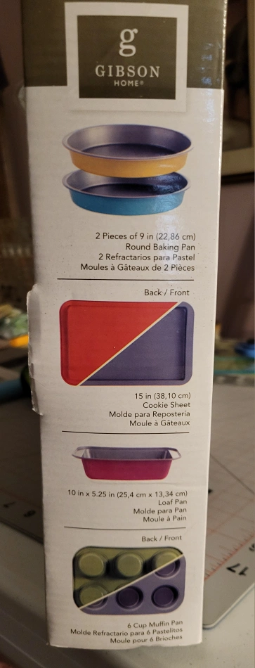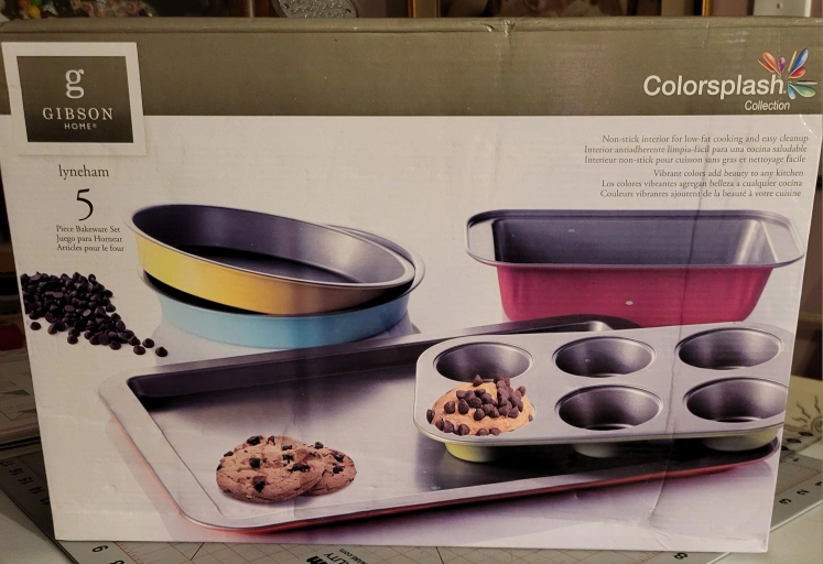 70New in box. Five-piece bakeware set. Includes two round baking pans, a rectangular baking pan, and a six-cup muffin pan. Non-stick interior. Vibrant pastel colours.