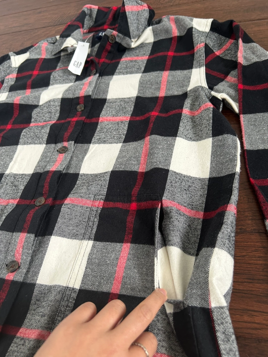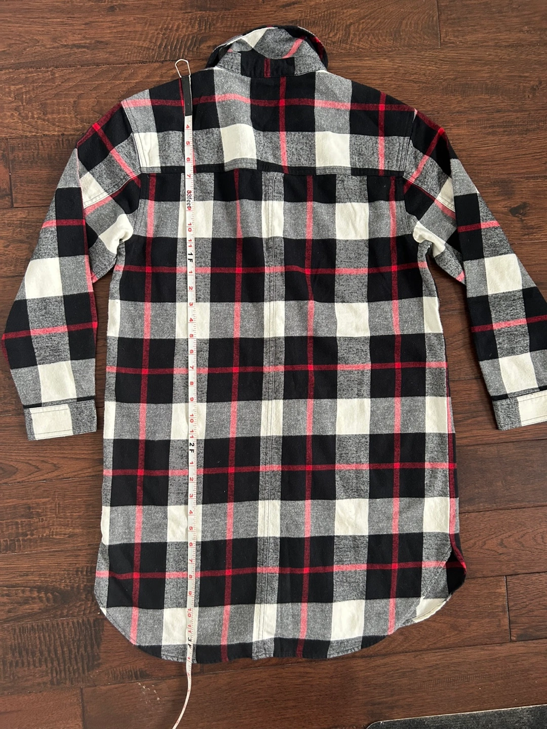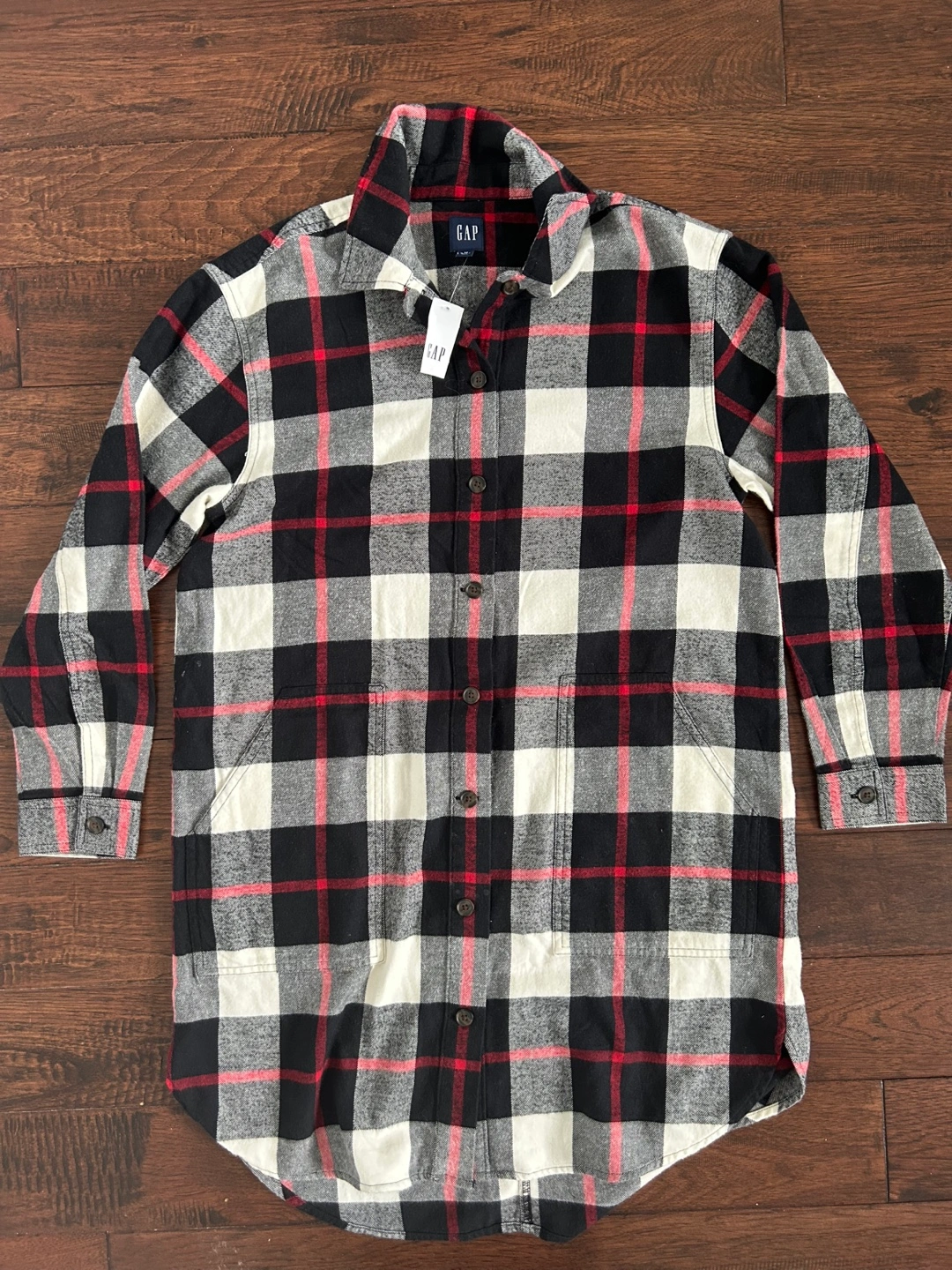 Long-sleeve flannel dress with black, red and white plaid pattern. Button closure. Comfy with two front pockets. Size small but fits loose and could probably fit a medium. Brand new with tags. Bought sale price for $65+tax.