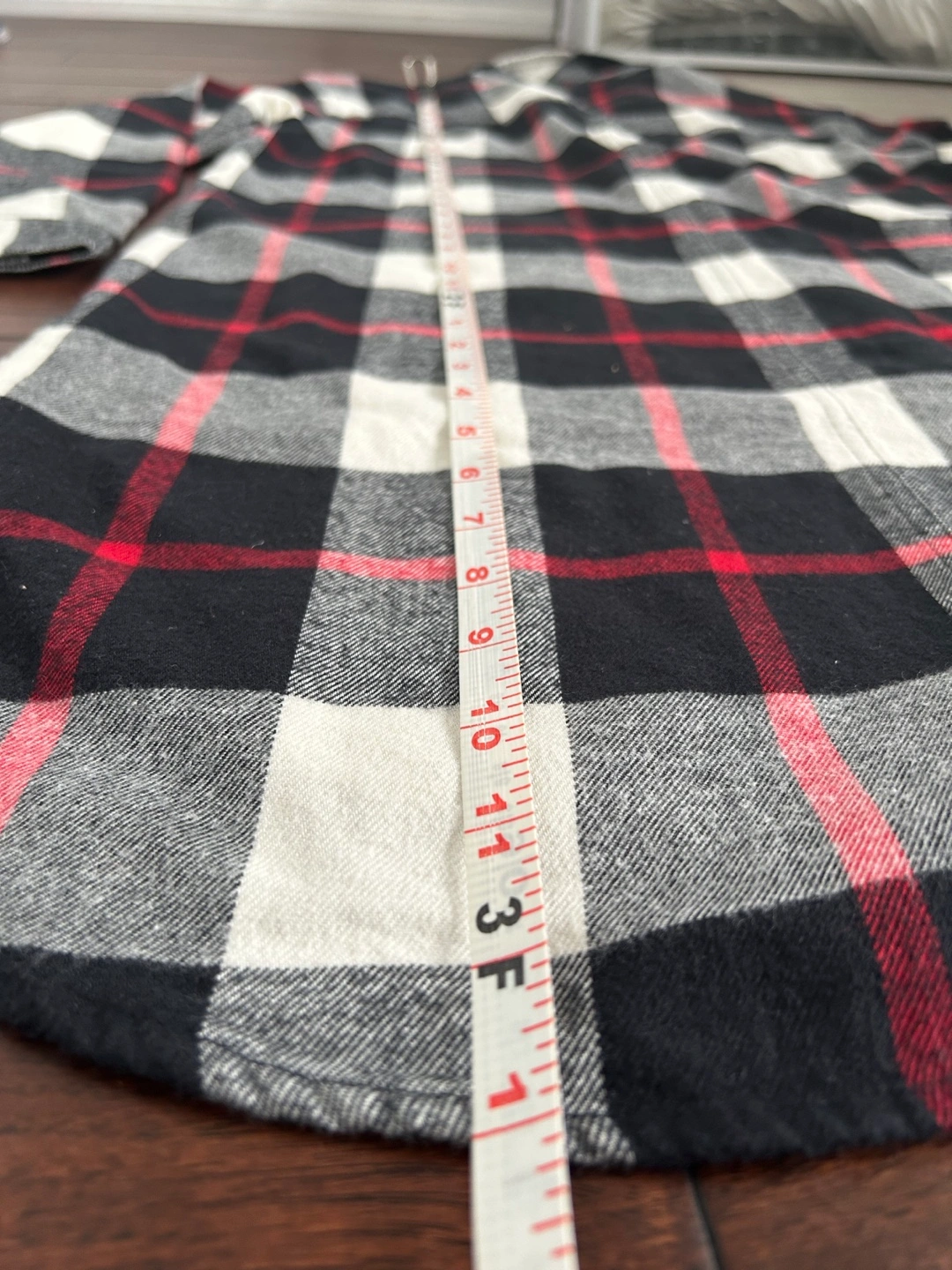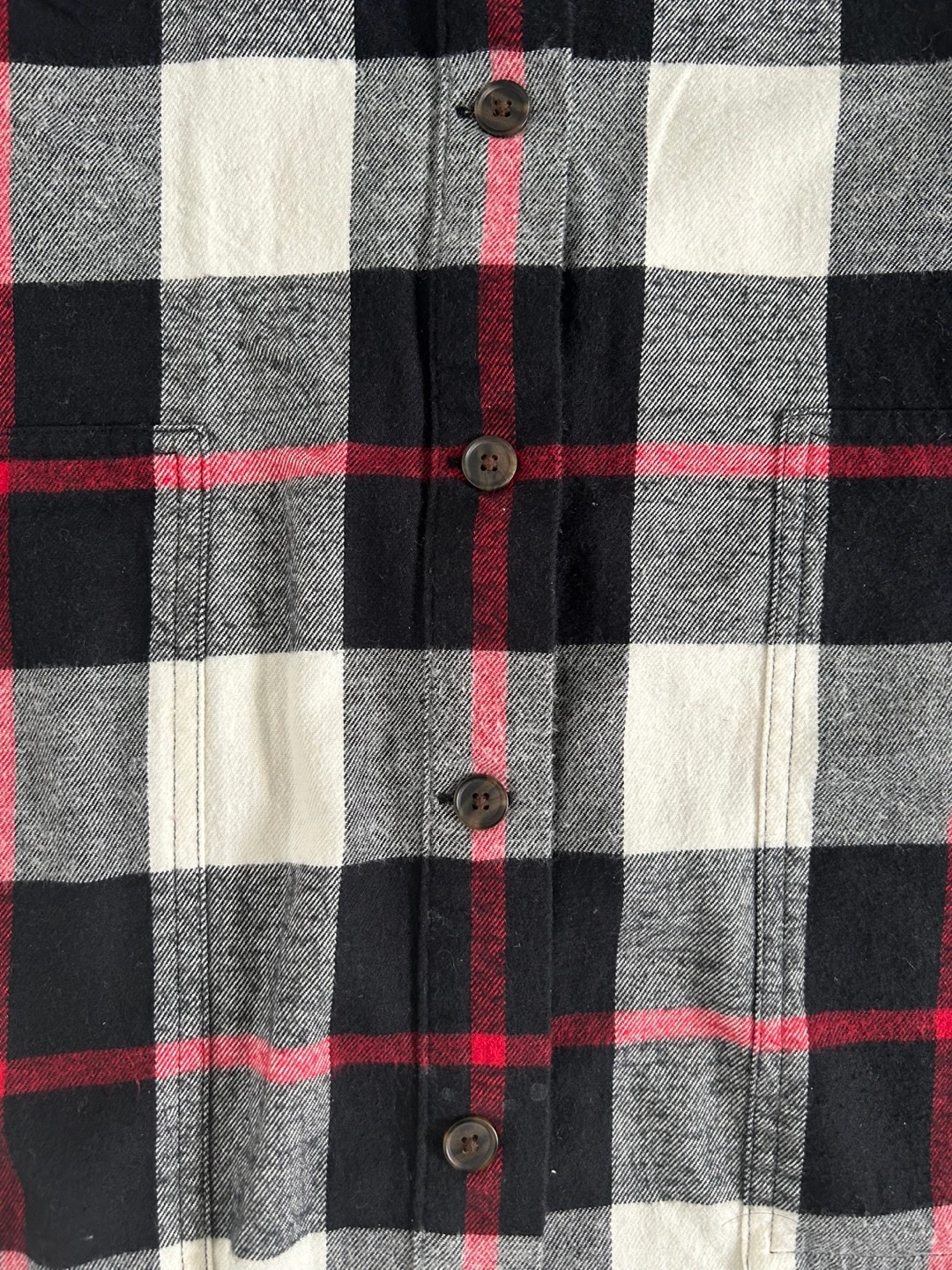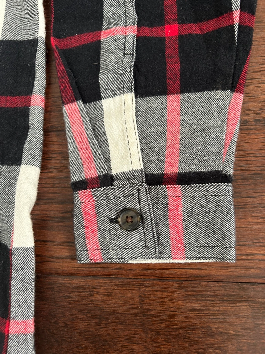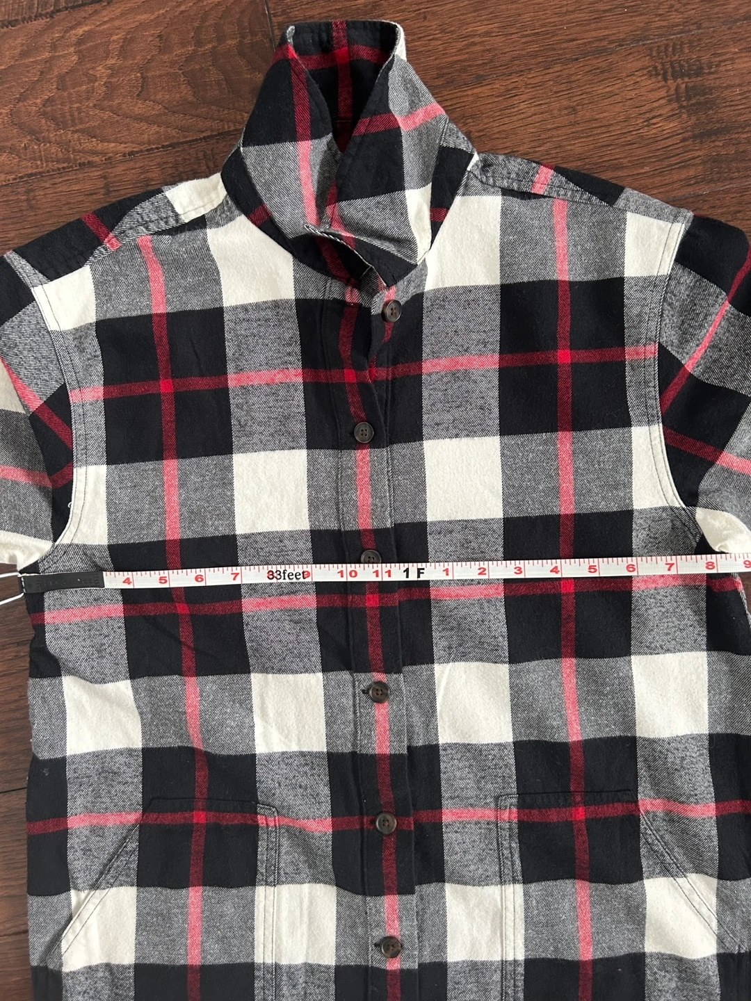 Long-sleeve flannel dress with black, red and white plaid pattern. Button closure. Comfy with two front pockets. Size small but fits loose and could probably fit a medium. Brand new with tags. Bought sale price for $65+tax.
