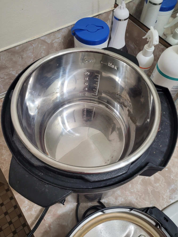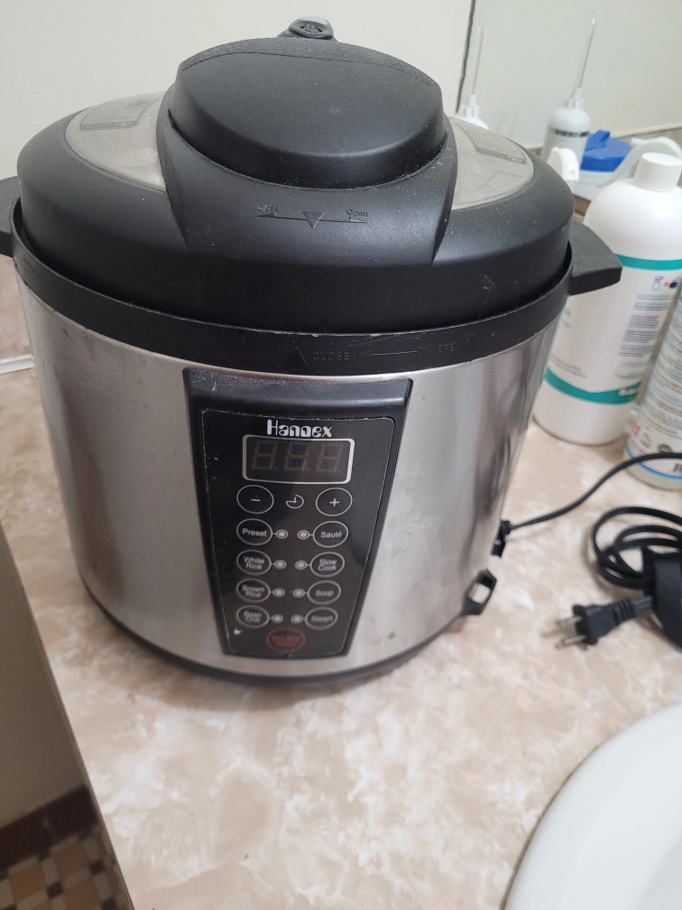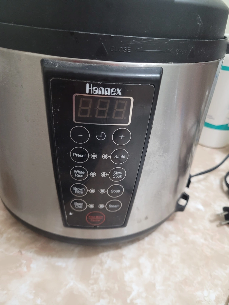 Stainless steel pressure-cooker. Features various cooking settings: Preset, white rice, brown rice, slow cook, bean chili, soup, steam, sauté. Includes power cord. Used but in good condition.