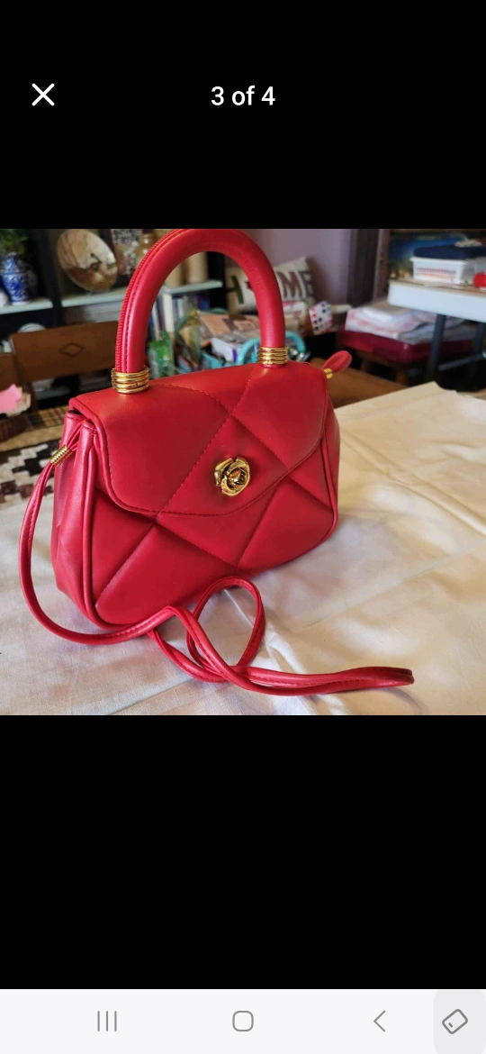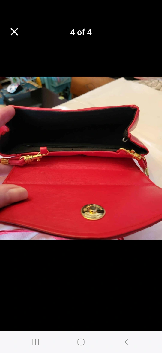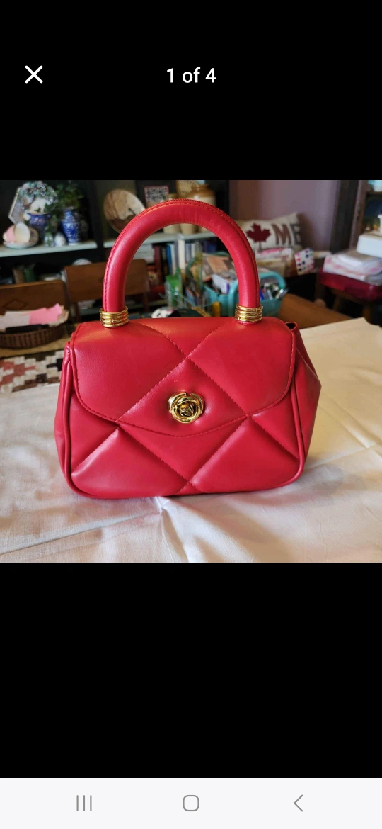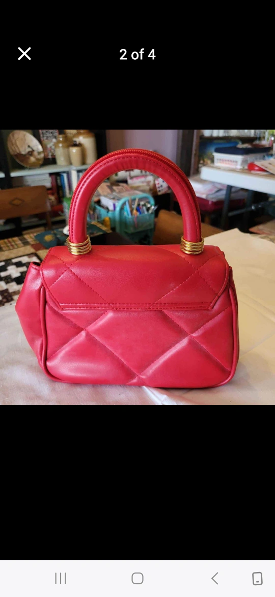 70Small red quilted purse. Features a top handle and a detachable shoulder strap. Gold-toned hardware. Zipper closure. Interior is black. Never used, brand new.