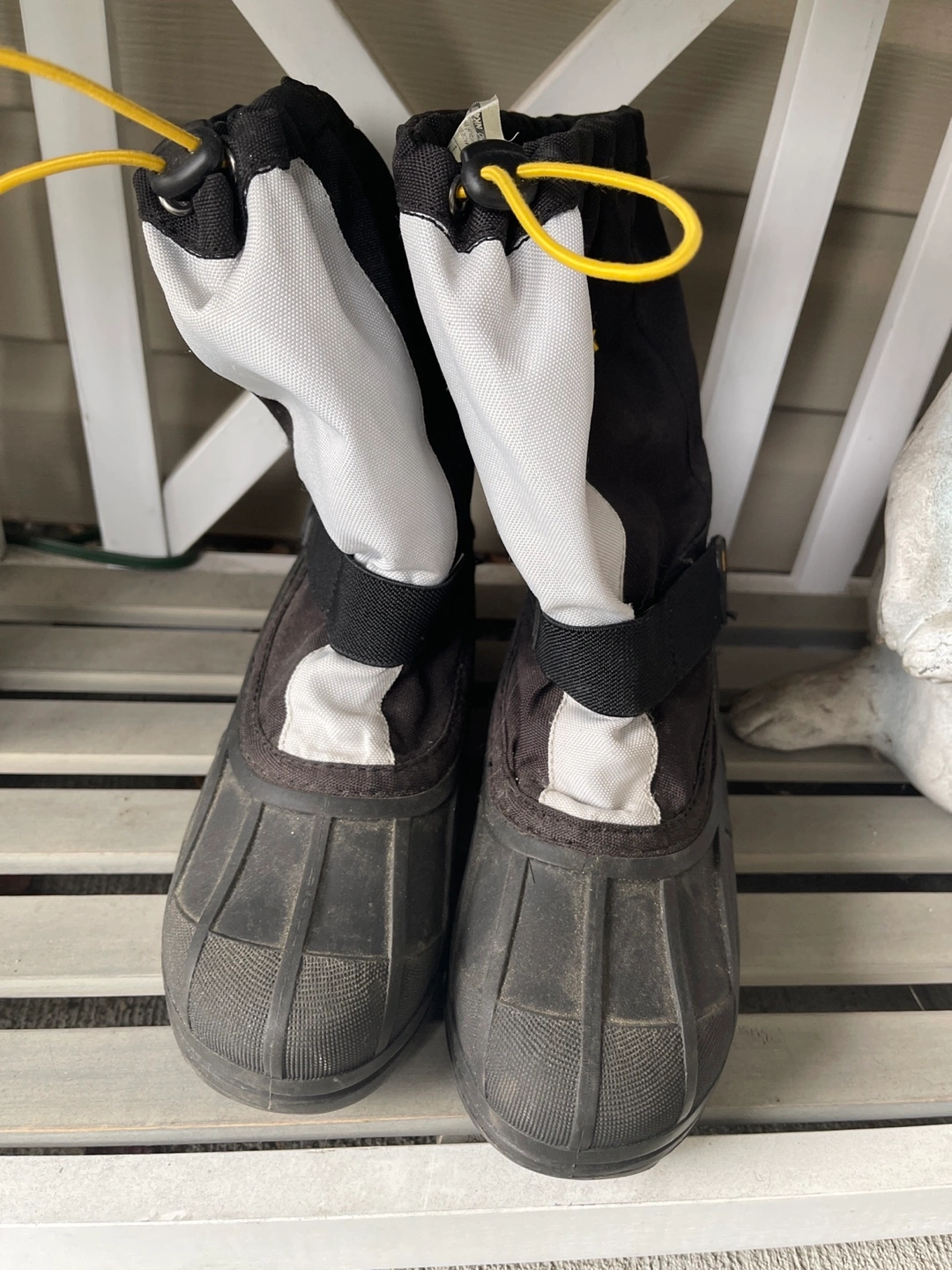 Black and white kids' winter boots. Rubber bottom, Adjustable straps. Yellow drawstrings. Pick up in east Maple Ridge