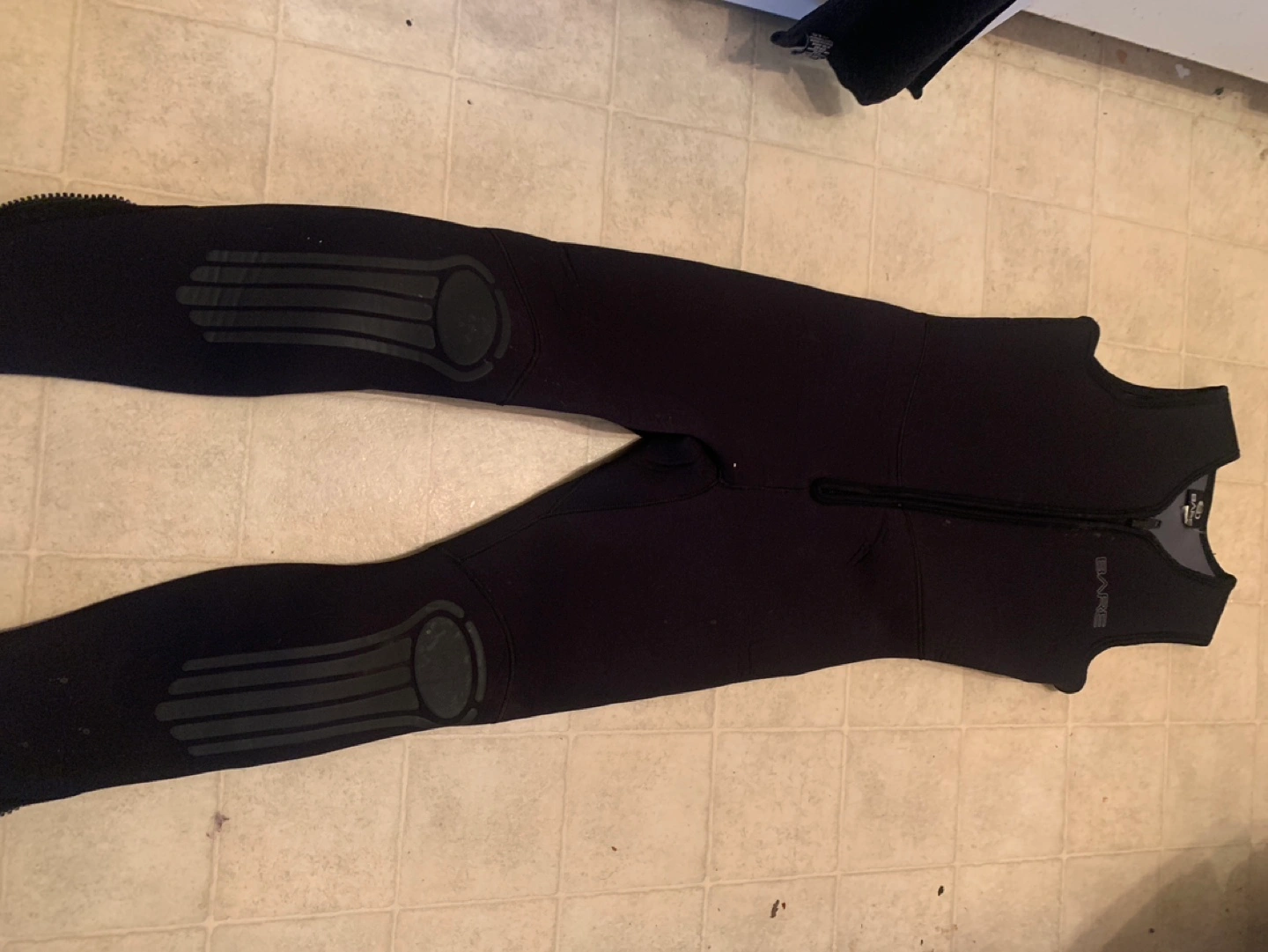 159Black neoprene jumpsuit. Full-length zipper. Knee pads. Good for diving or watersports. Obo