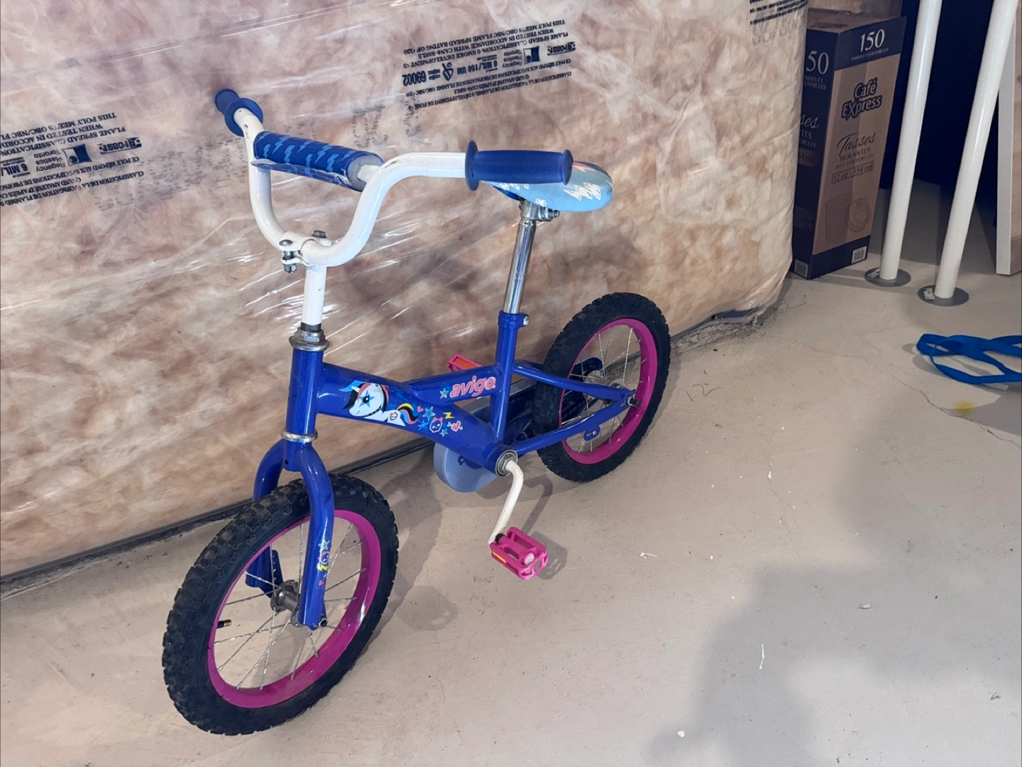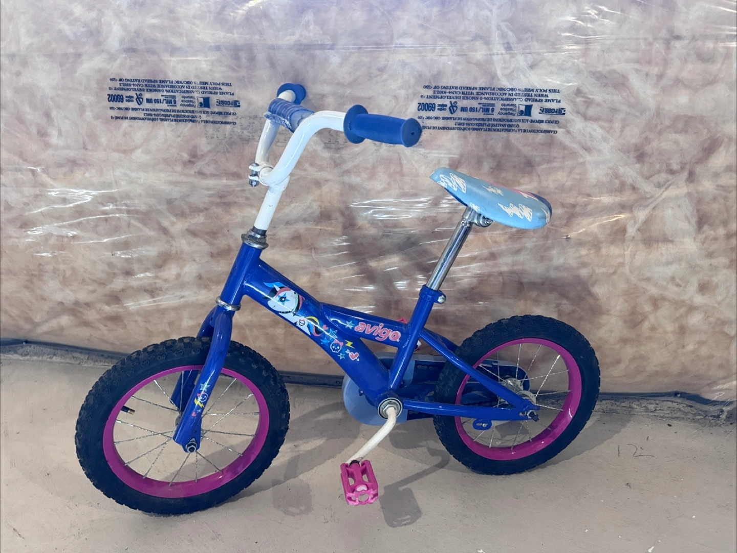 Selling a cute Avigo kids' bike! It's in good condition and ready for a new rider. The bike features a blue frame with pink accents on the wheels and pedals. Perfect for little ones learning to ride!