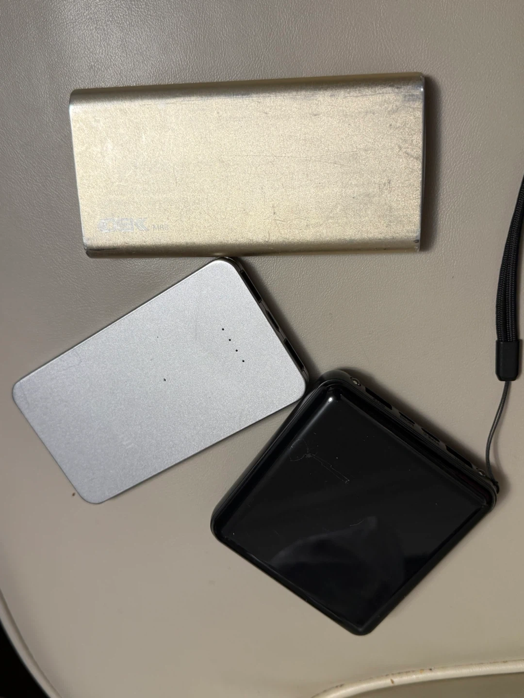 Three power banks for charging devices on the go. Includes a gold, silver, and black unit. They're great for keeping your electronics powered up when you're away from an outlet.