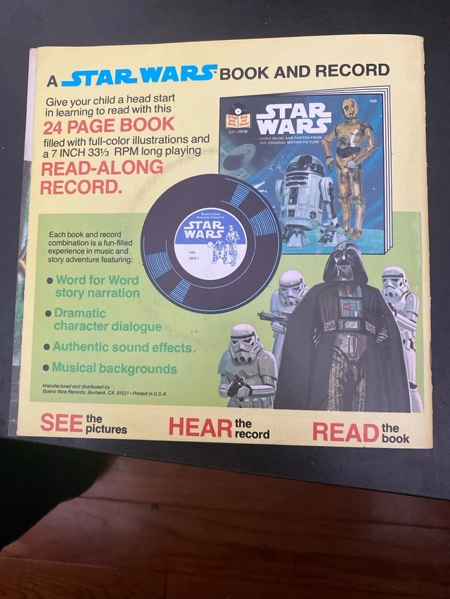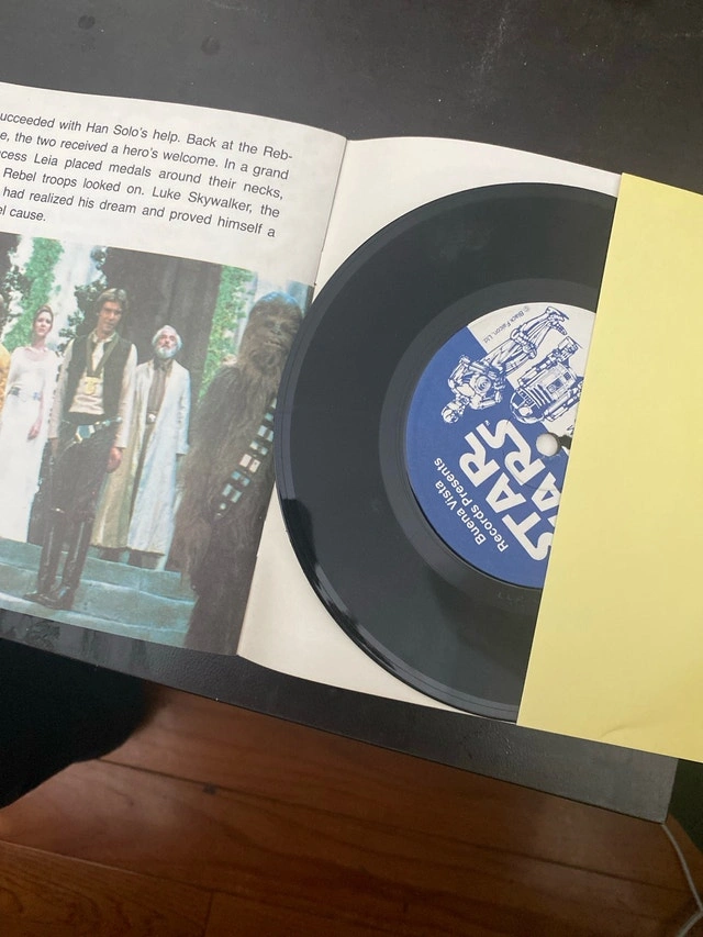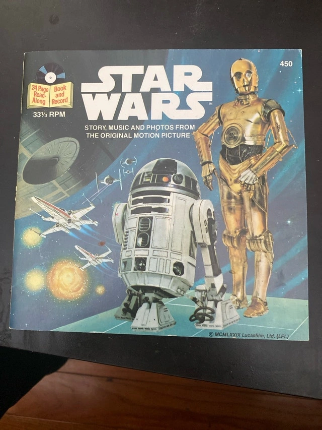 Relive the magic of the original Star Wars motion picture with this vintage 1979 book and record set, featuring story, music, and photos. While the item has been enjoyed, it remains in good condition for its age. Feel the Force with this nostalgic piece! If you see this ad, the book and record are still available, ready to transport you to a galaxy far, far away. Cash accepted.