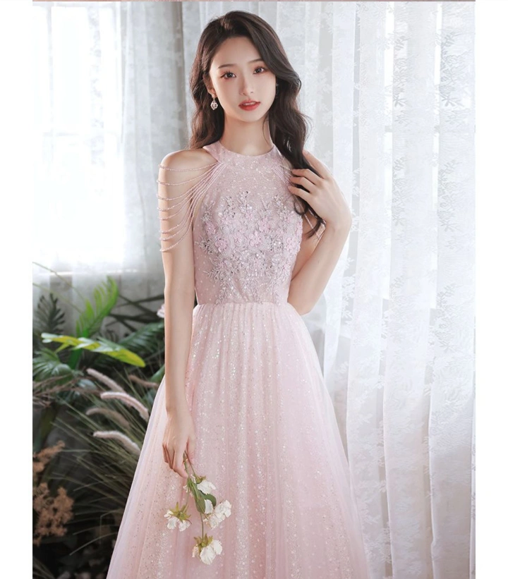 Beautiful pink floor-length gown. Sparkly sequin Halter neckline with beaded detailing. Sleeveless with chain shoulder straps. Perfect for prom, wedding, or other formal event.