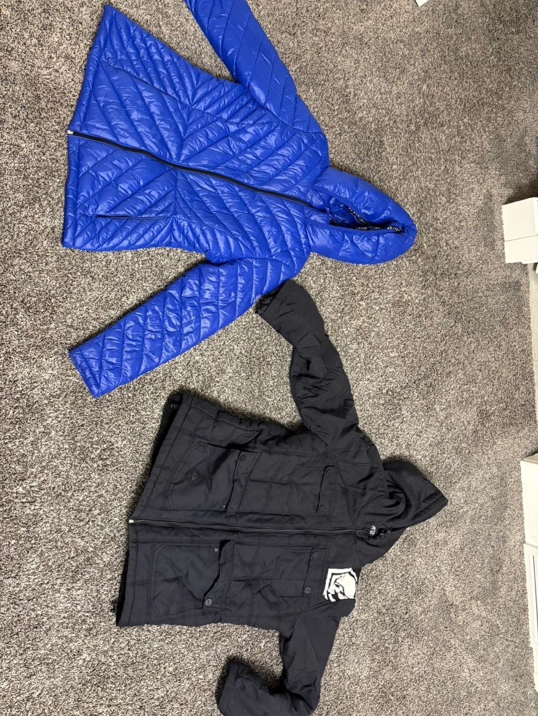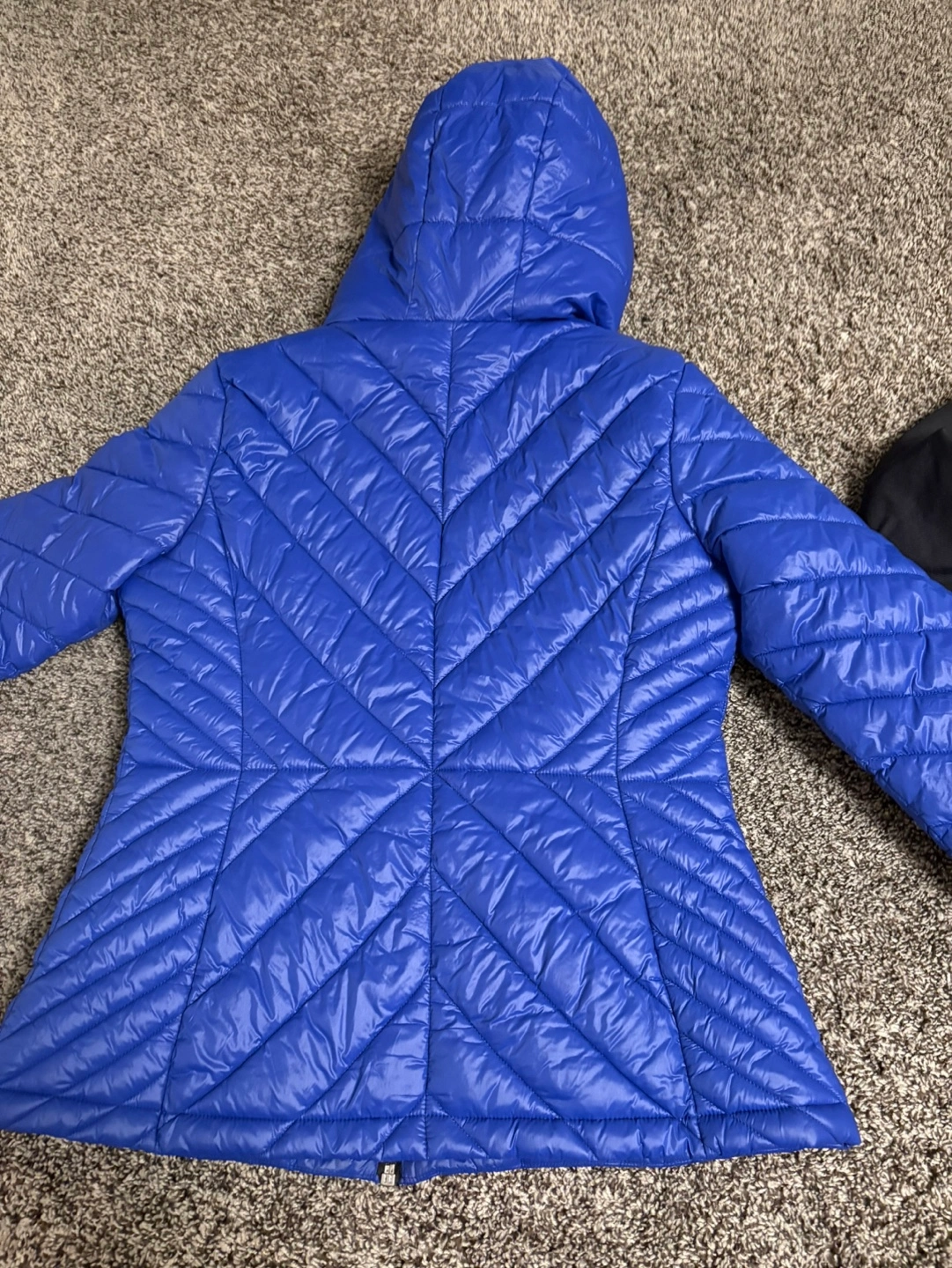 Two warm jackets, one black and one blue. Both feature hoods and zip closures. One jacket is a quilted design, the other features chevron quilting. Sizes may vary. Pre-owned. $15 each