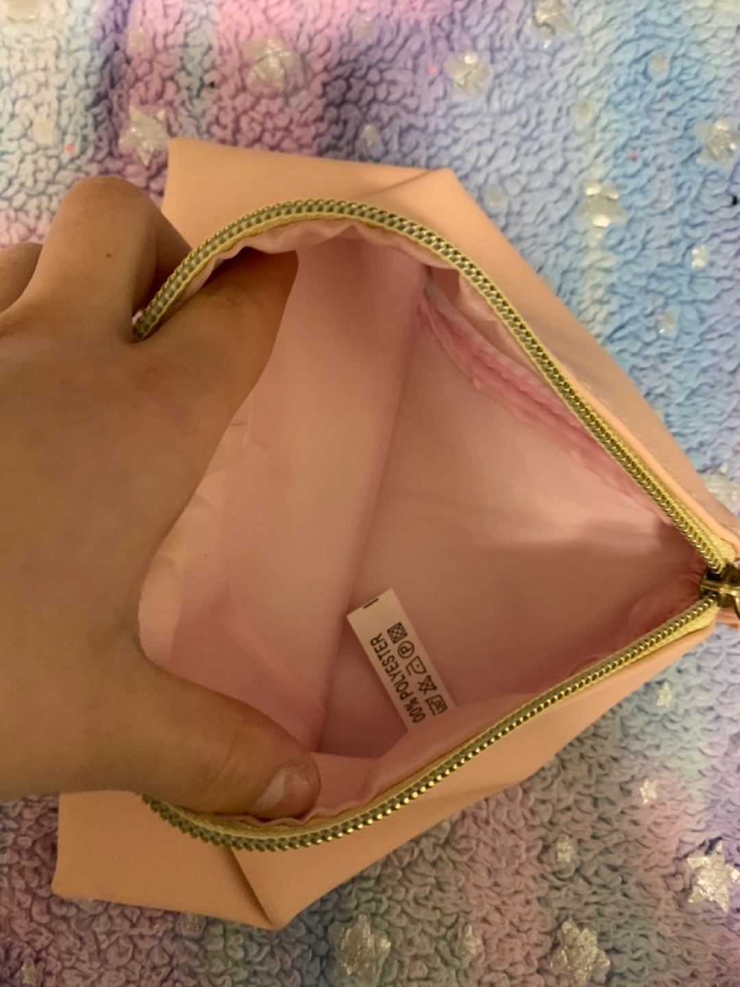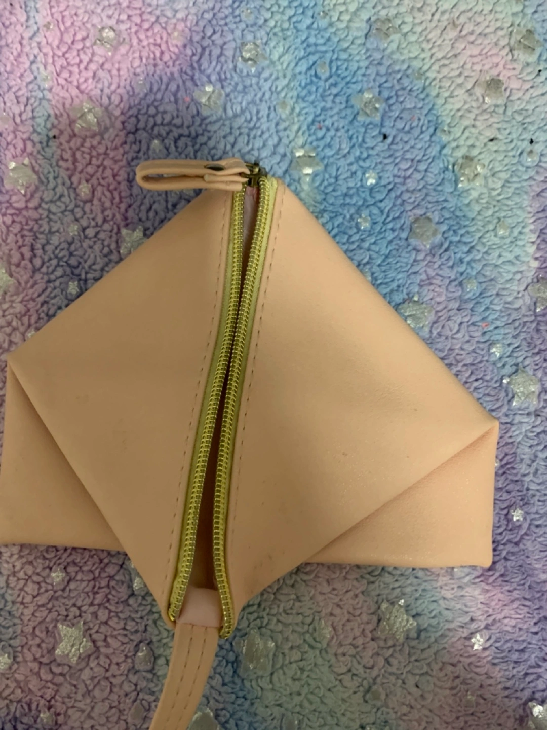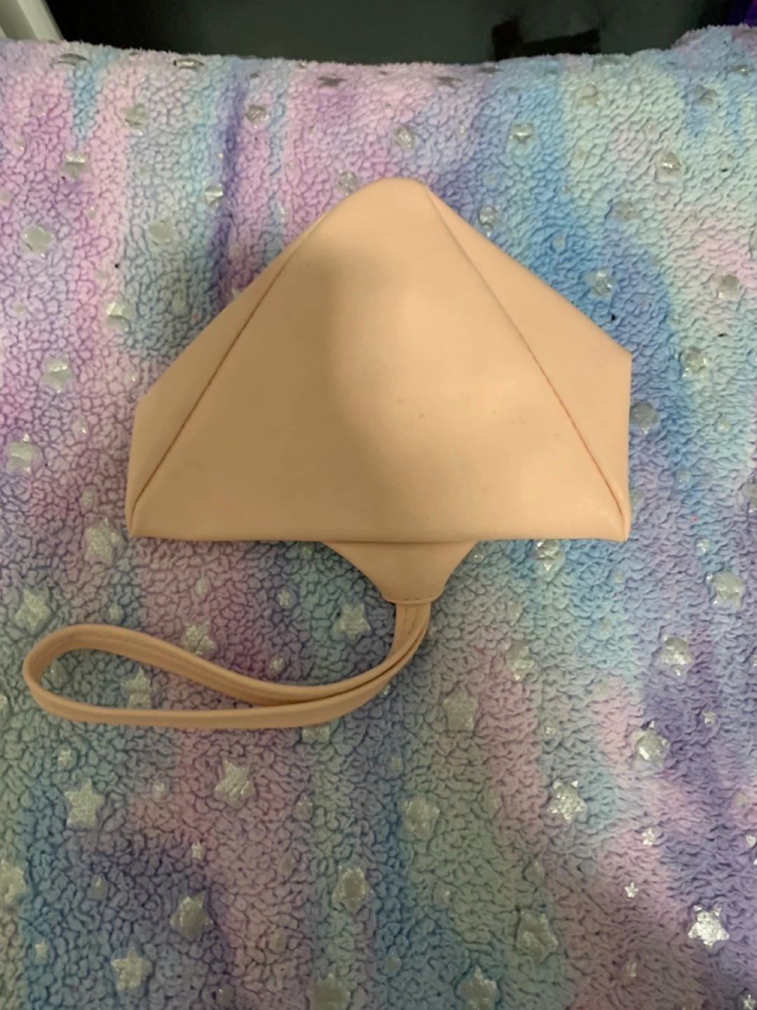Unique pink pouch. Triangle shape. Gold zipper. Small wrist strap. Polyester material. Zara