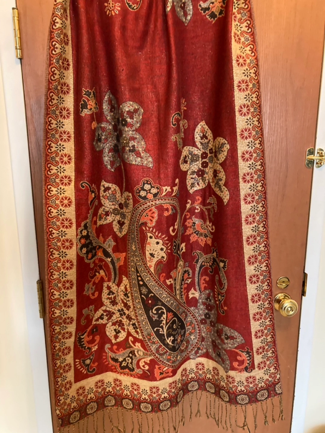 109Unique Beautiful red pashmina shawl. Features a paisley pattern with floral accents. Fringed edges. Soft material. Perfect for adding a touch of elegance to any outfit.