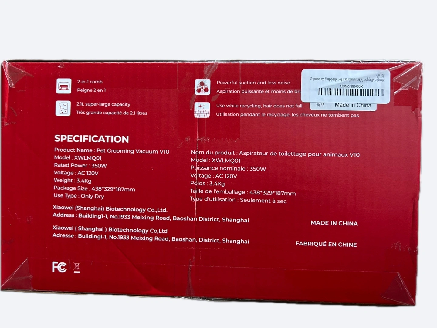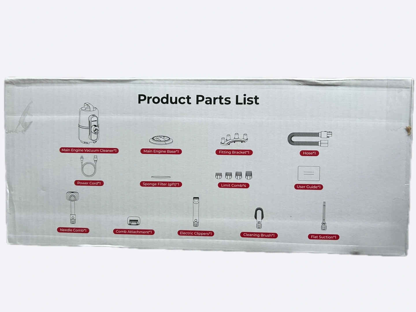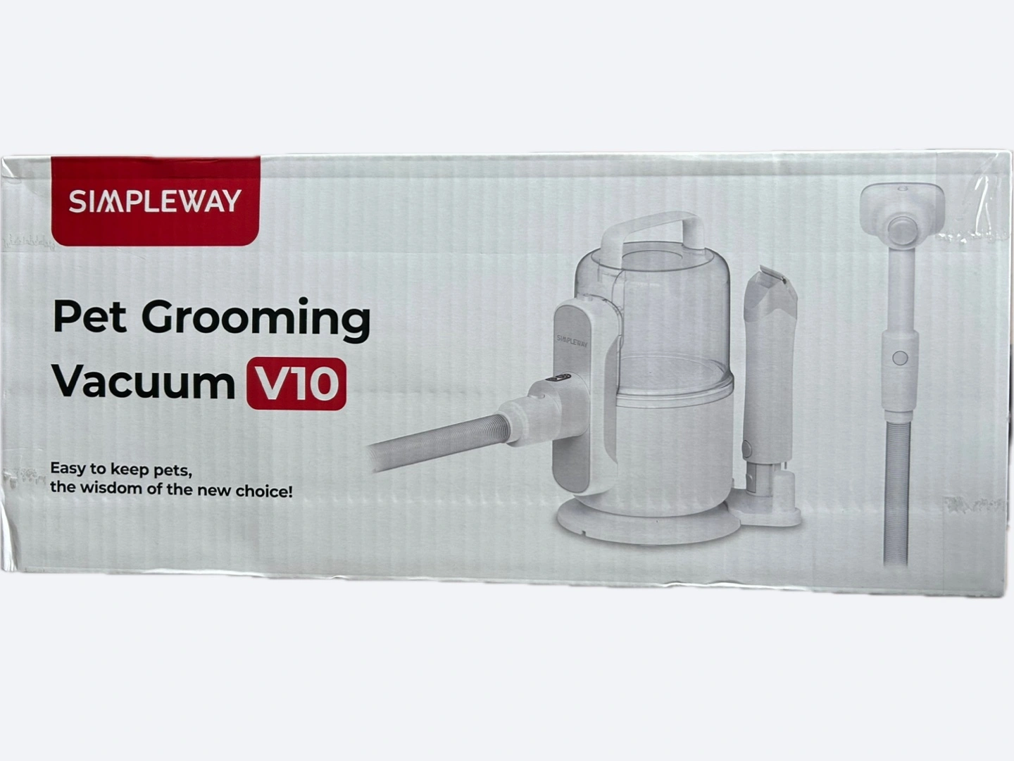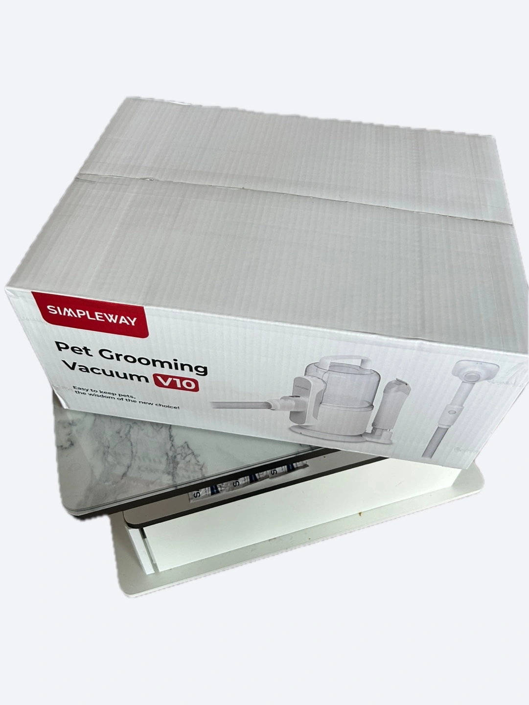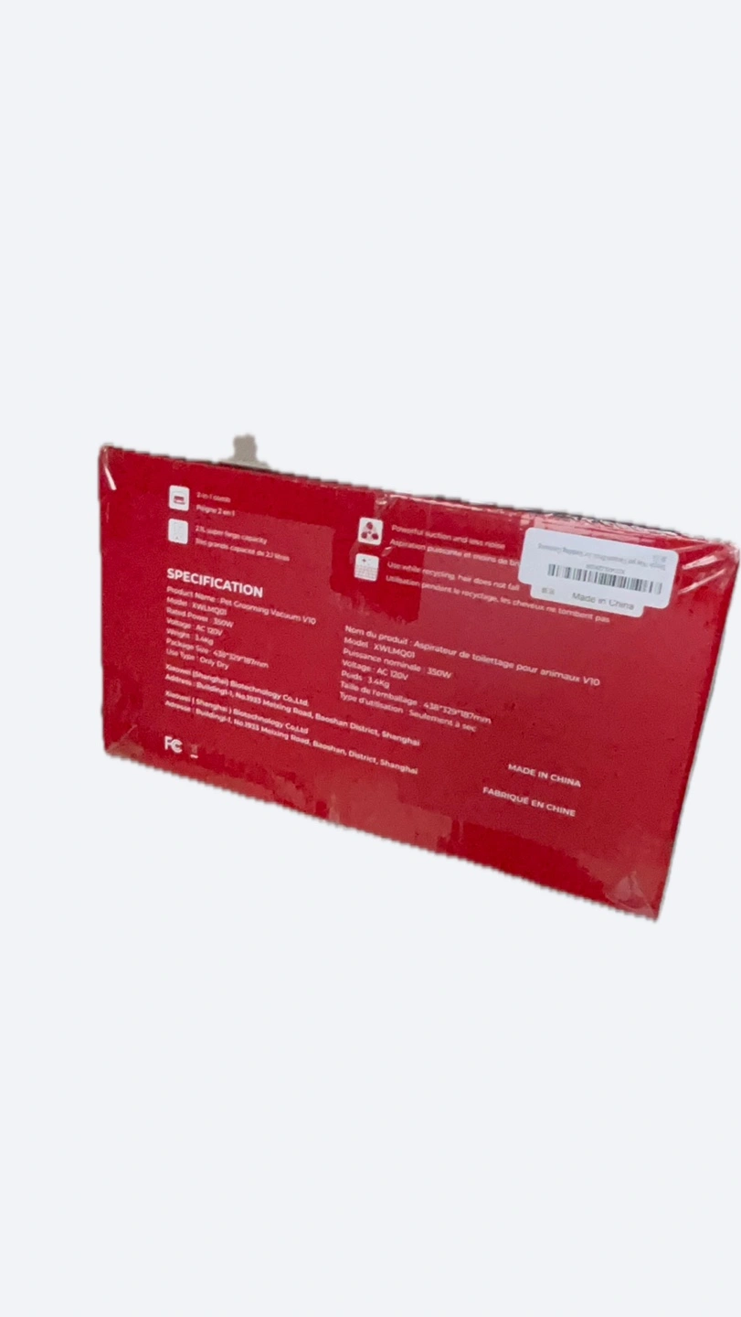 New, unused pet grooming vacuum. Includes multiple attachments. Powerful suction and low noise. 2-in-1 comb. Large capacity.