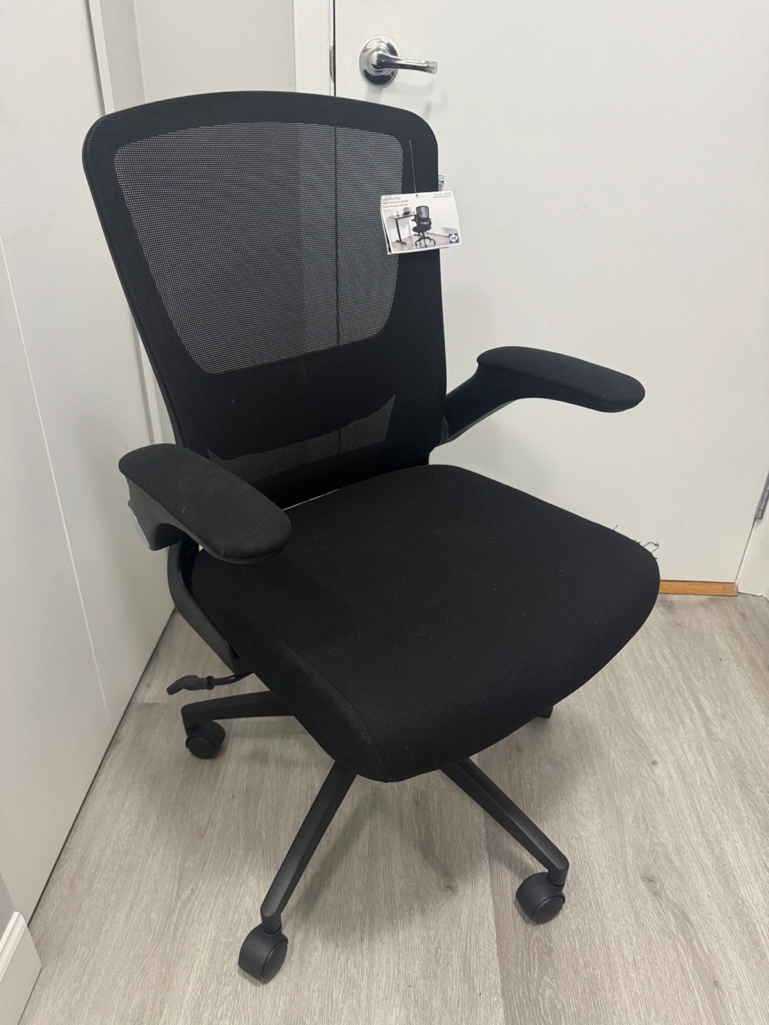 Comfortable office chair. Black mesh back and fabric seat. Adjustable arms. Five caster wheels. Great for home or office use.