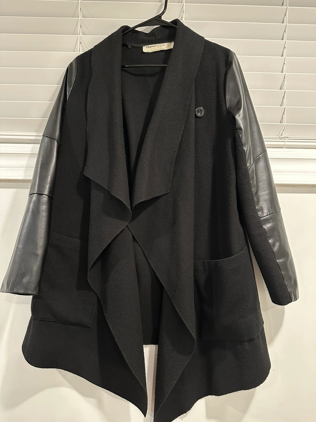 71Women's black open-front cardigan. Features faux leather sleeves and pockets. Relaxed fit.