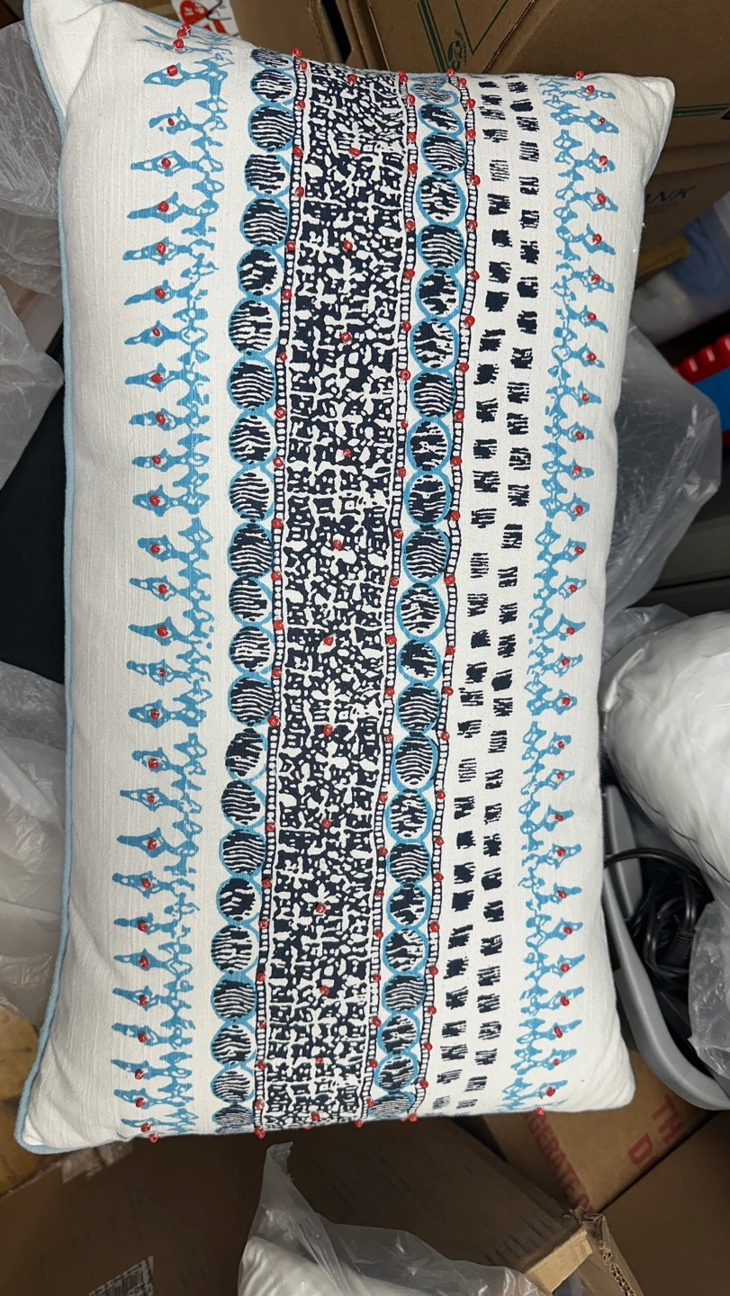 Rectangular throw pillow. Features a white background with navy, light blue, and red accents. Embellished with small beads. Suitable for home décor. Only used for staging