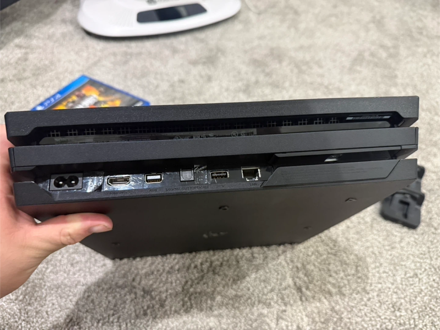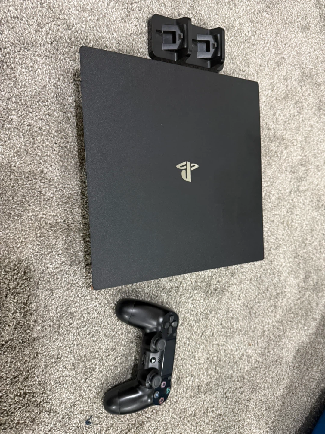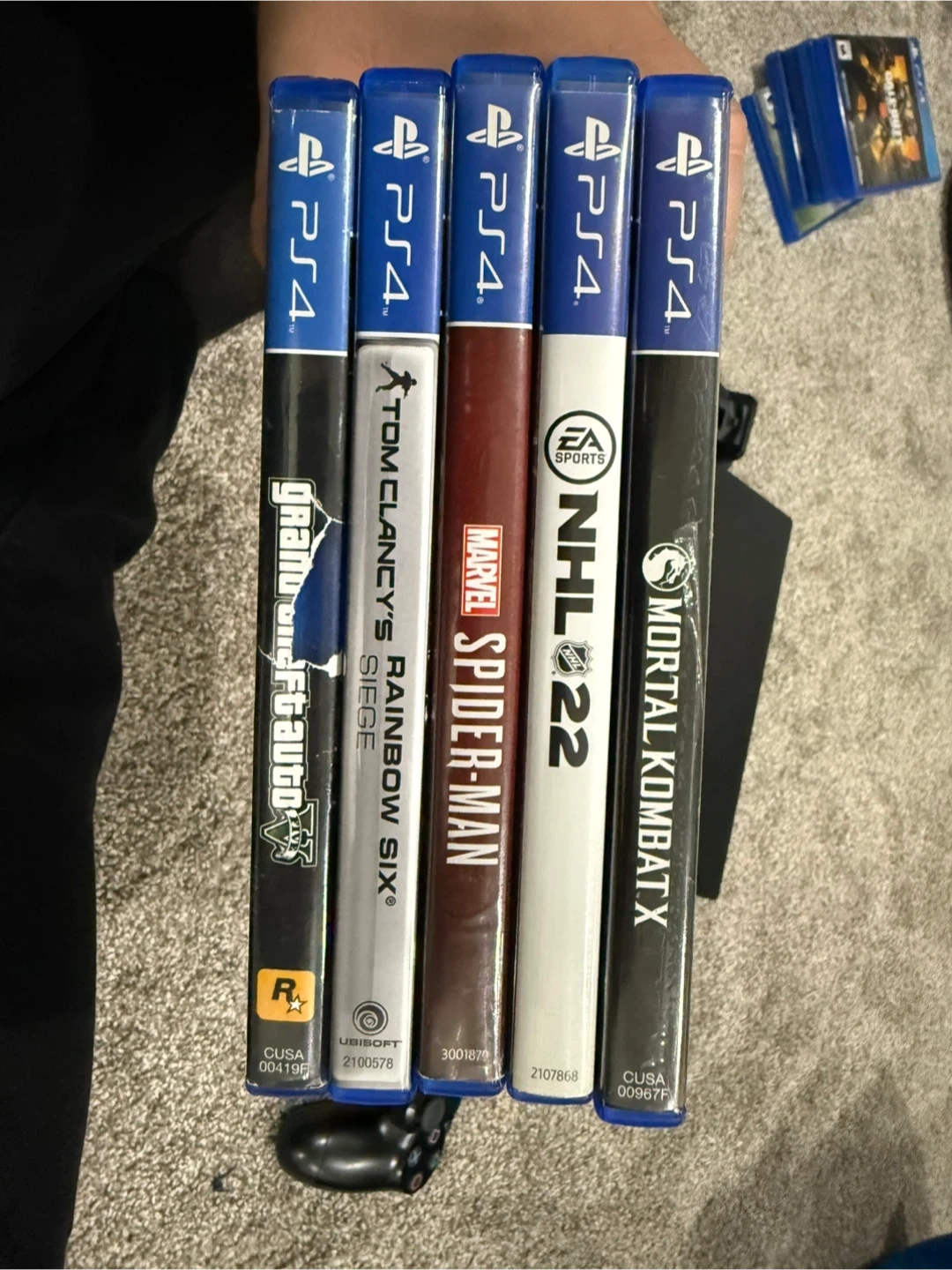 This is a Sony PlayStation 4 Pro console with 1TB of storage. It comes with one controller, a charging dock, and several games including Grand Theft Auto V, Tom Clancy's Rainbow Six Siege, Marvel's Spider-Man, NHL 22, and Mortal Kombat X. It's in black.