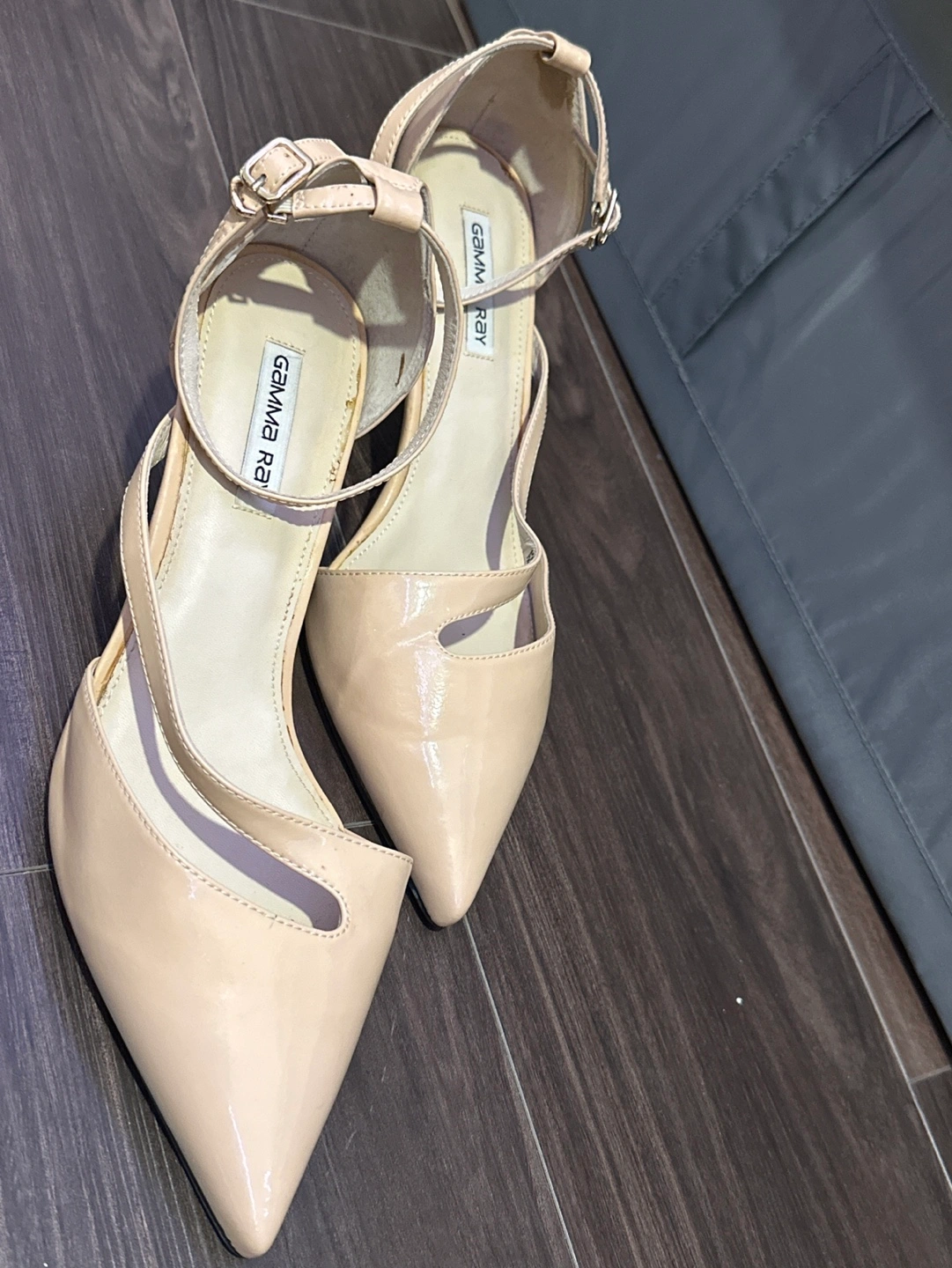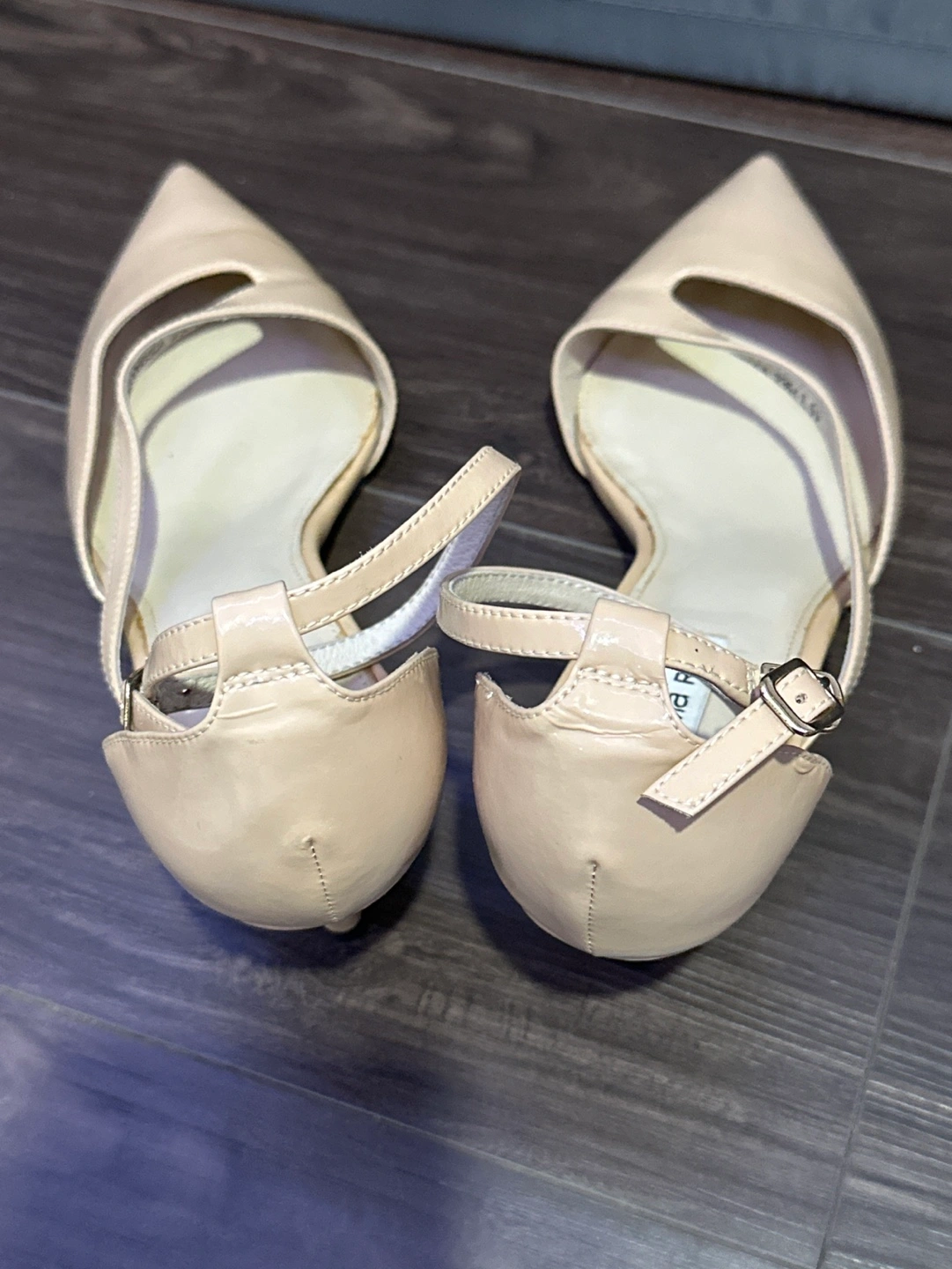 Nude pink patent leather heels. Ankle strap with buckle closure. Pointed toe. Low kitten heel. Elegant design. Worn once.