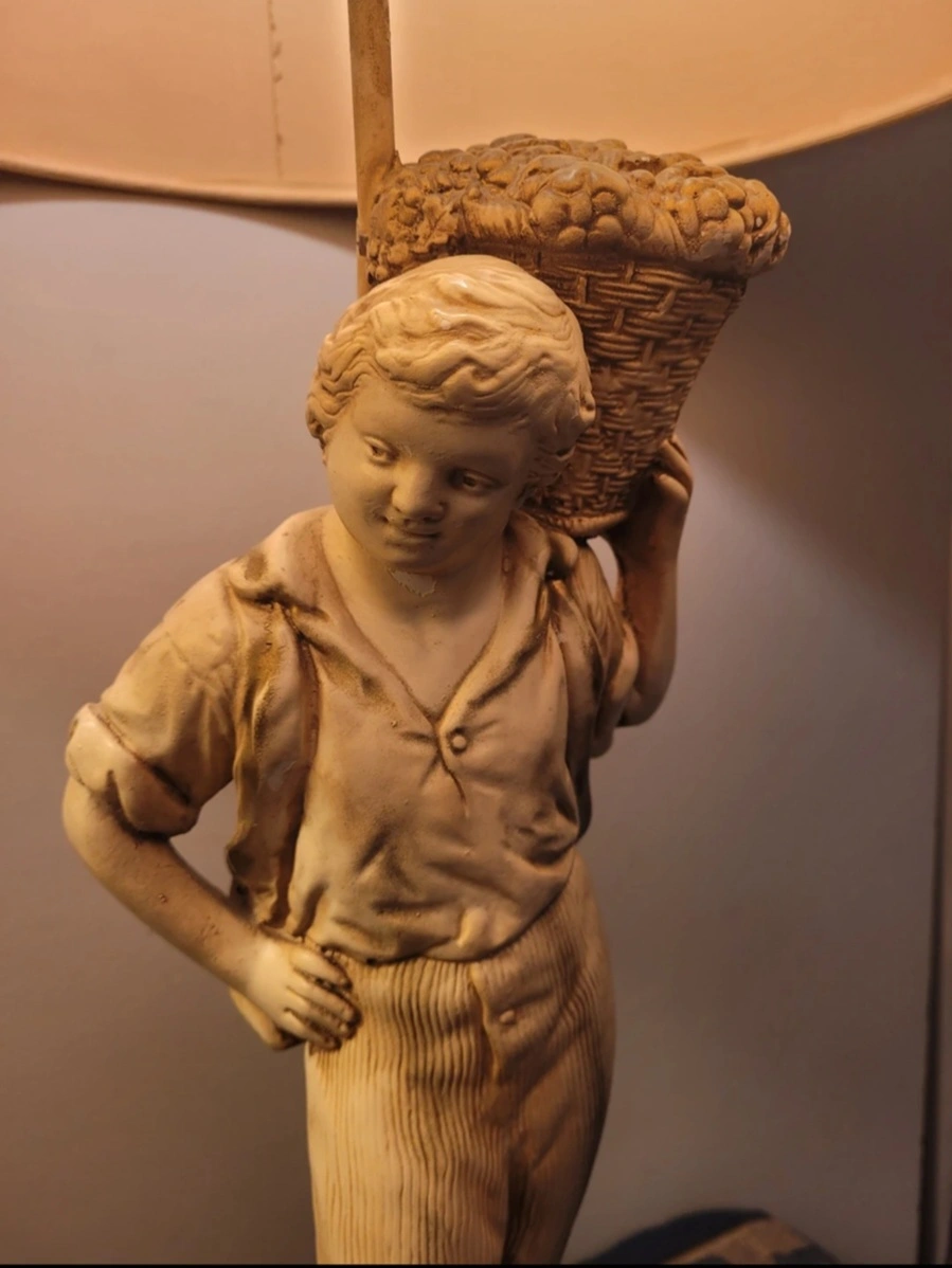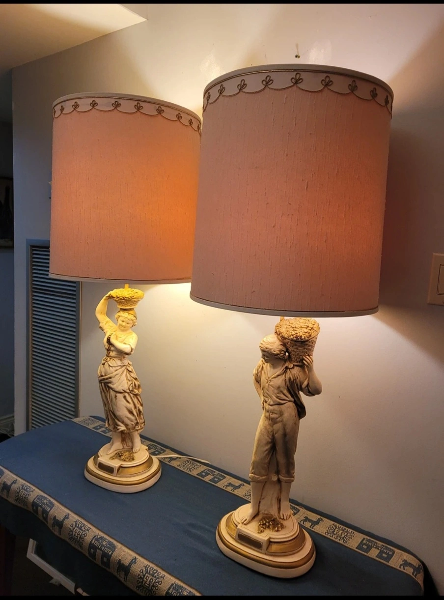 349Matching pair of vintage table lamps. Each features a sculpted figurine carrying a basket. Cream coloured with gold accents. Pink lampshades included. Excellent addition to any vintage or antique collection.