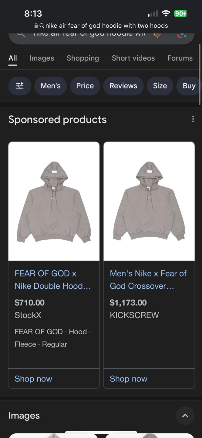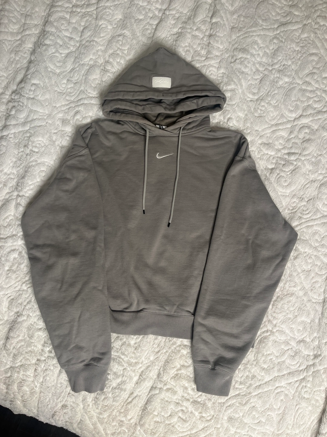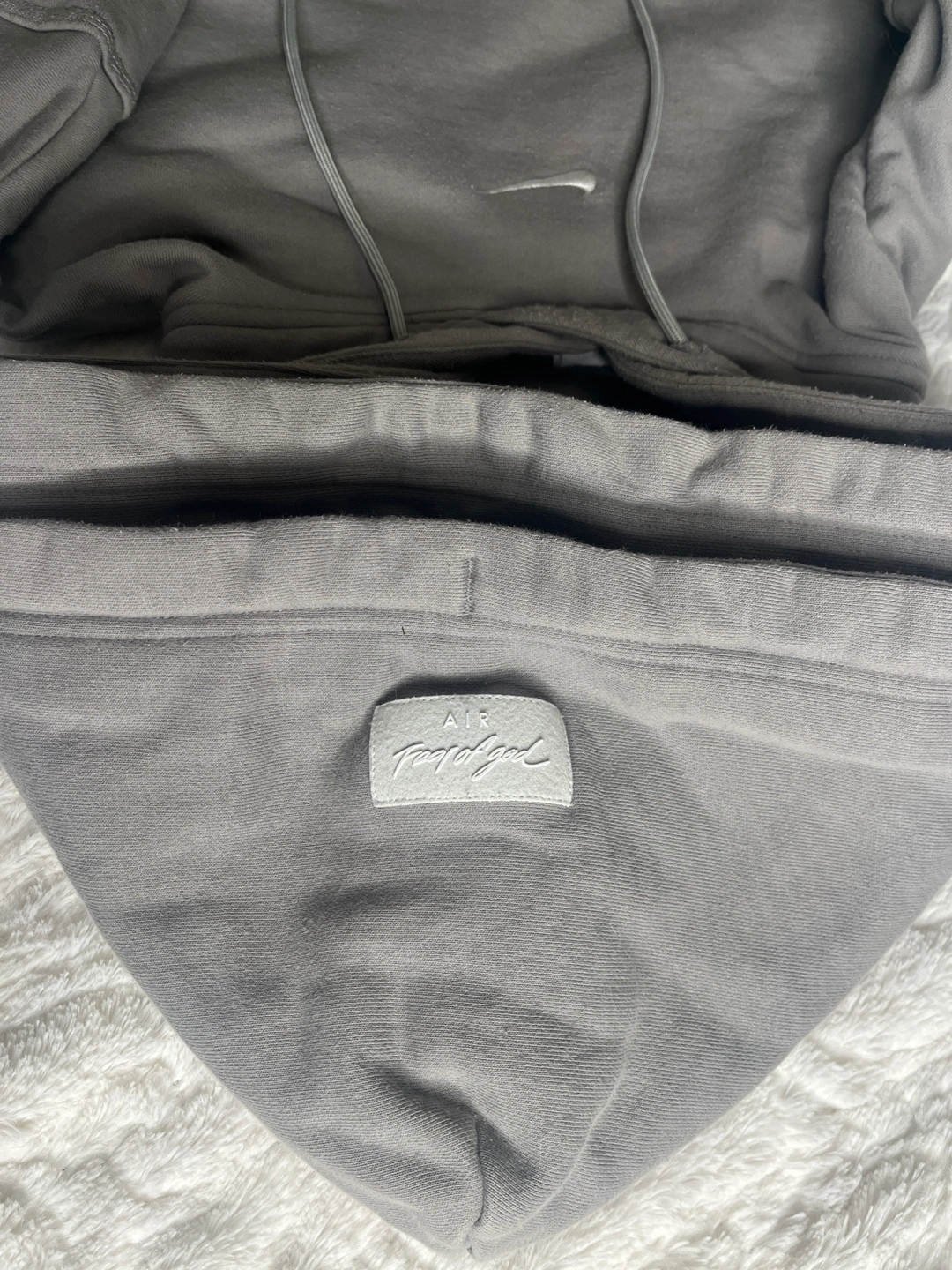 Grey double-hooded sweatshirt. Size Large. Features a small Nike swoosh and Fear of God branding. Warn once. Happy to answer any questions!