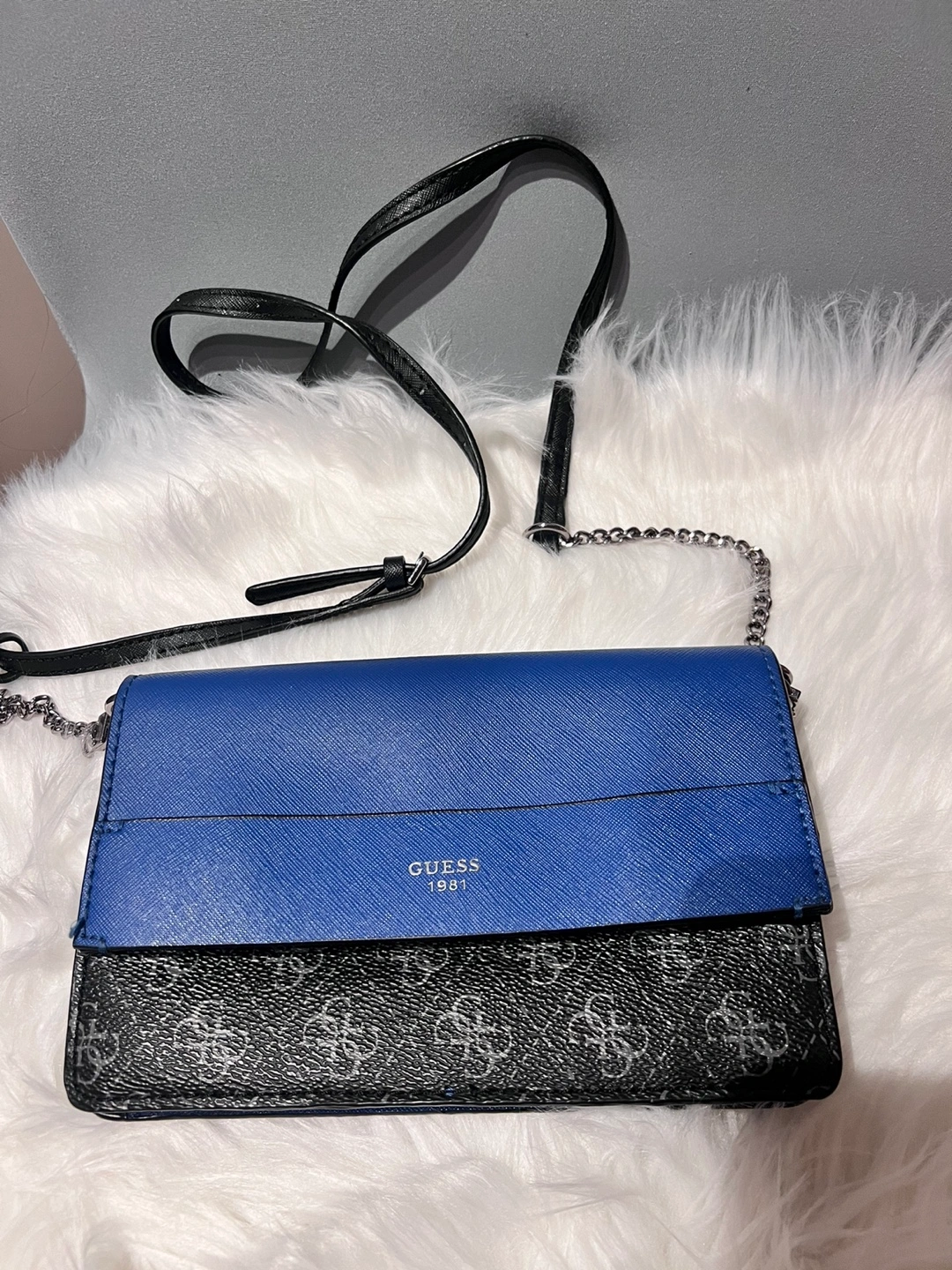112Small crossbody bag. Black and blue. Features a chain strap and zipper closure. Guess logo visible inside and out.