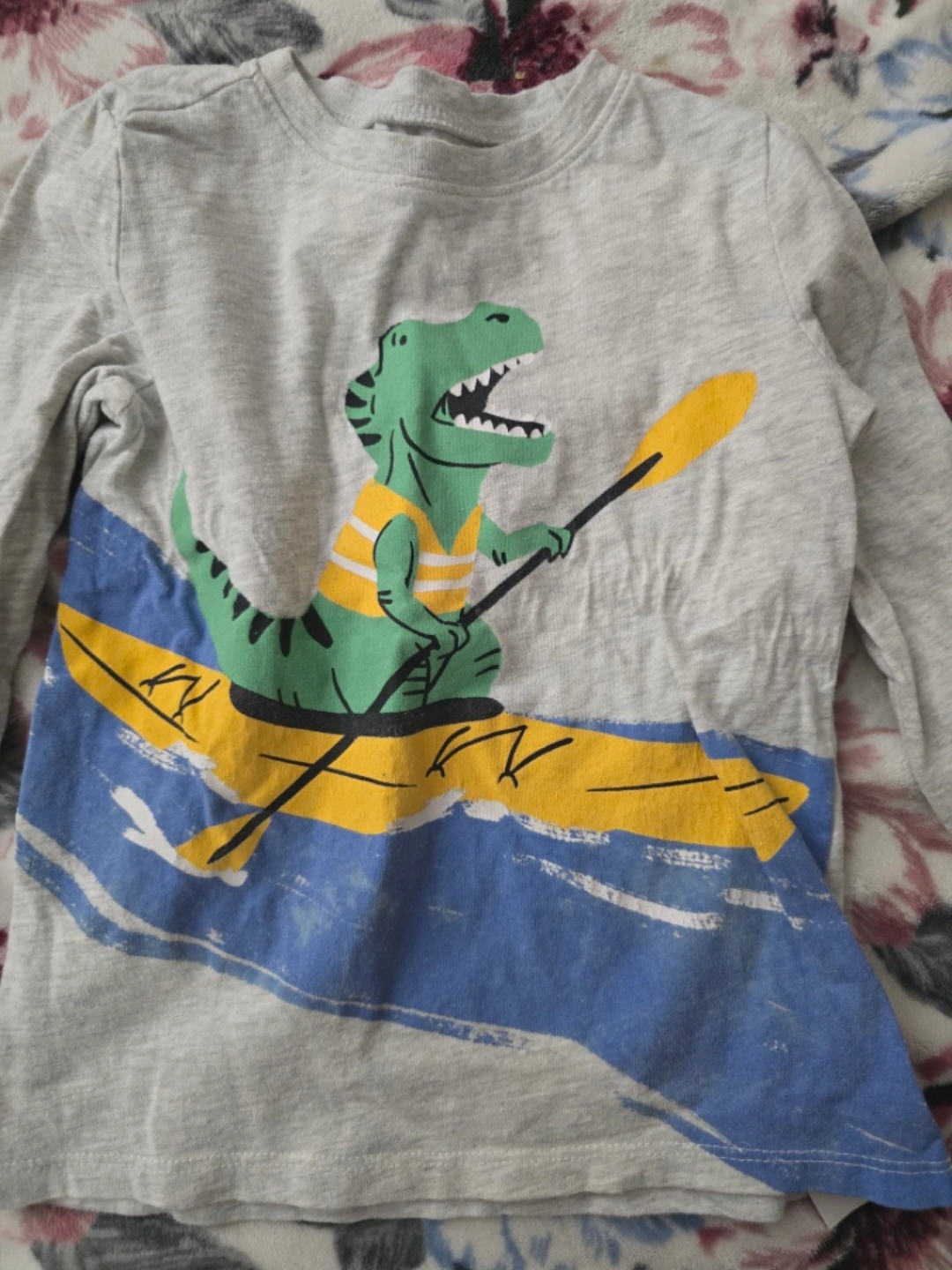 old navy Gray long sleeve shirt. Features a dinosaur kayaking graphic. Size 5T. Made in Guatemala.