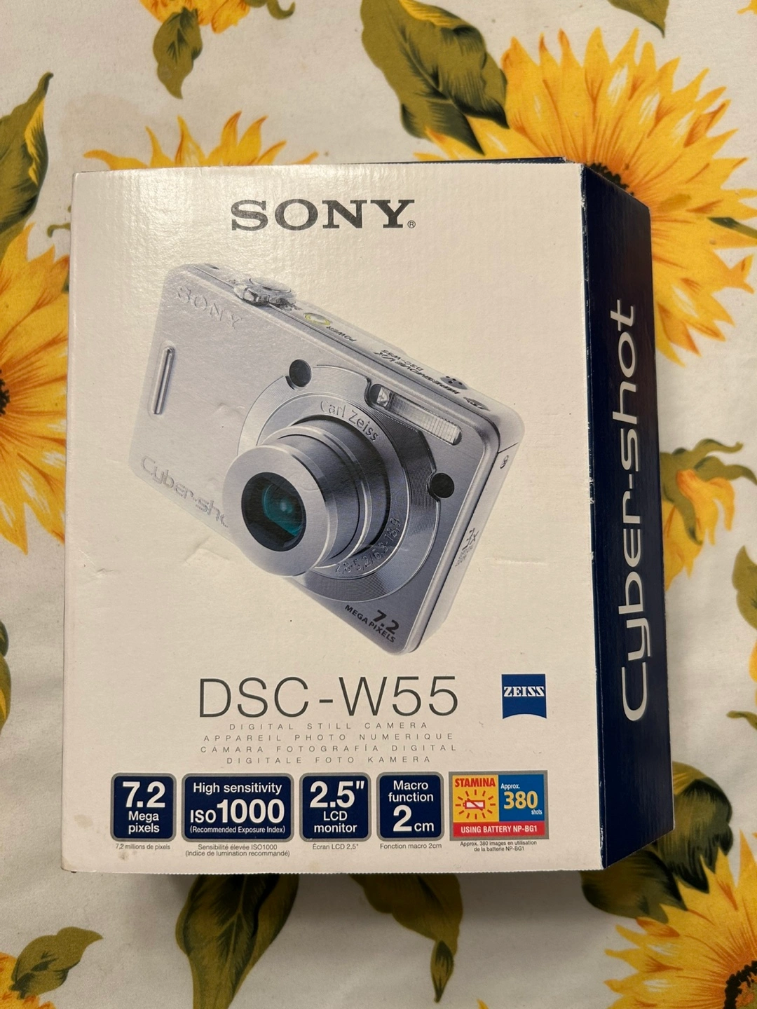 Sony Cyber-Shot DSC-W55 7.2MP 3x Optical Zoom Digital Camera. Comes complete in box with all wires, manual, SD card, battery and wall charger.