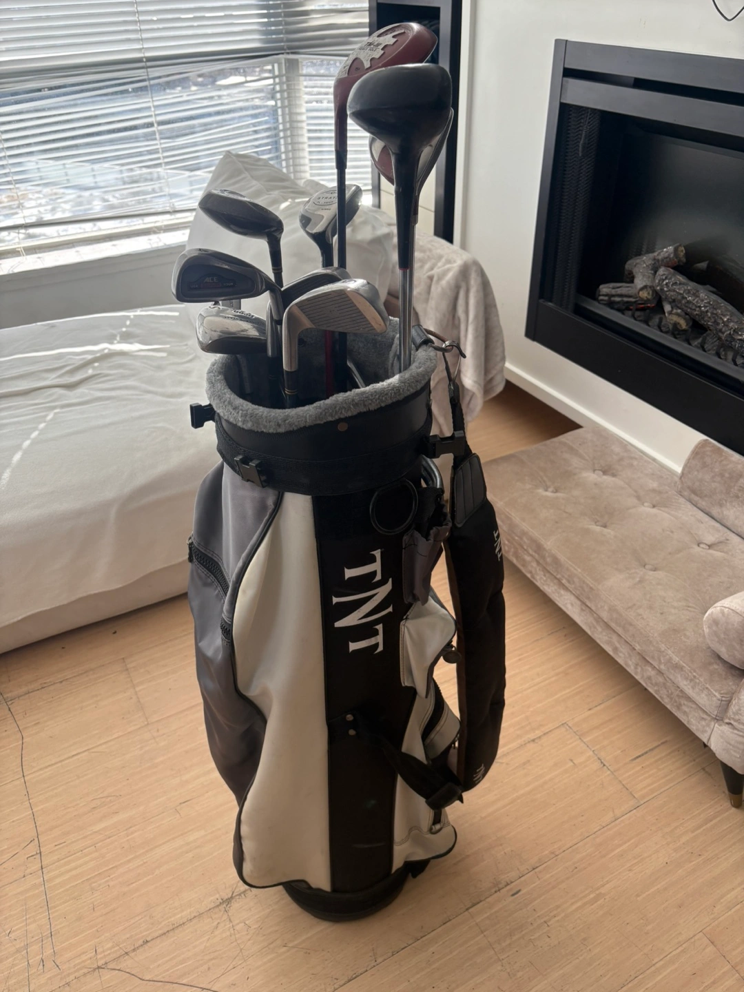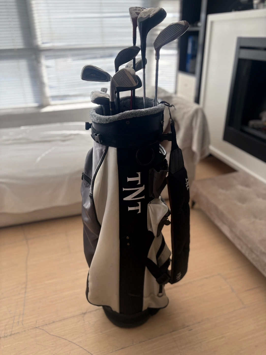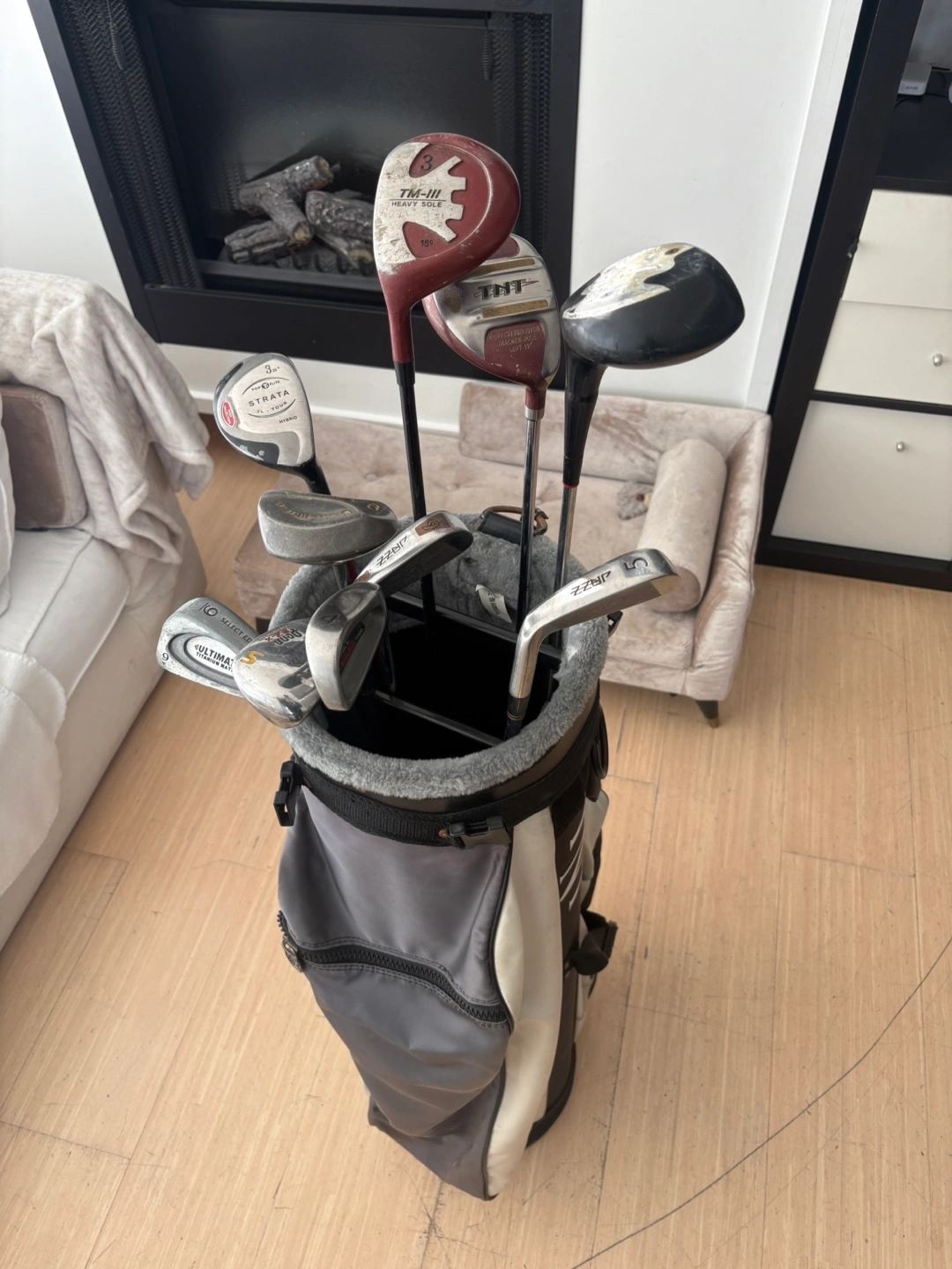 57Complete golf club set. Includes irons and golf bag. Good condition, some wear and tear. Clubs show signs of use.