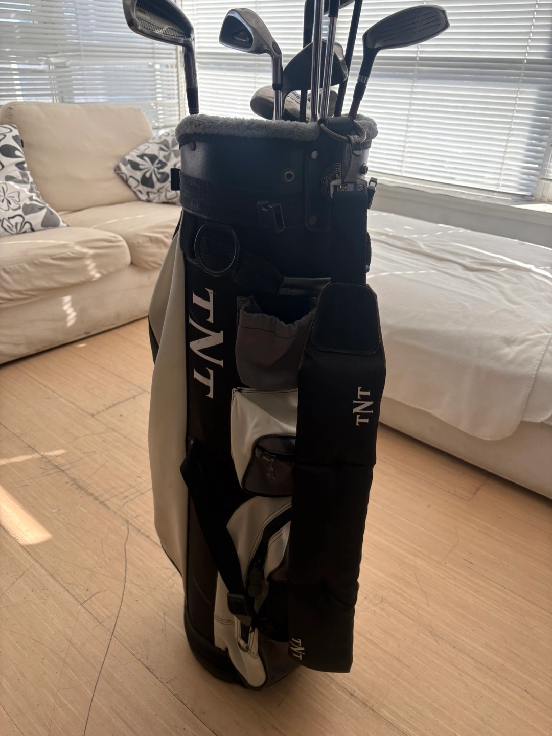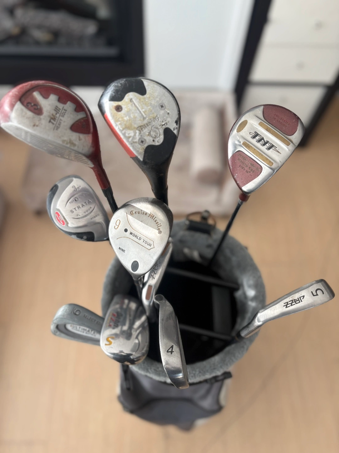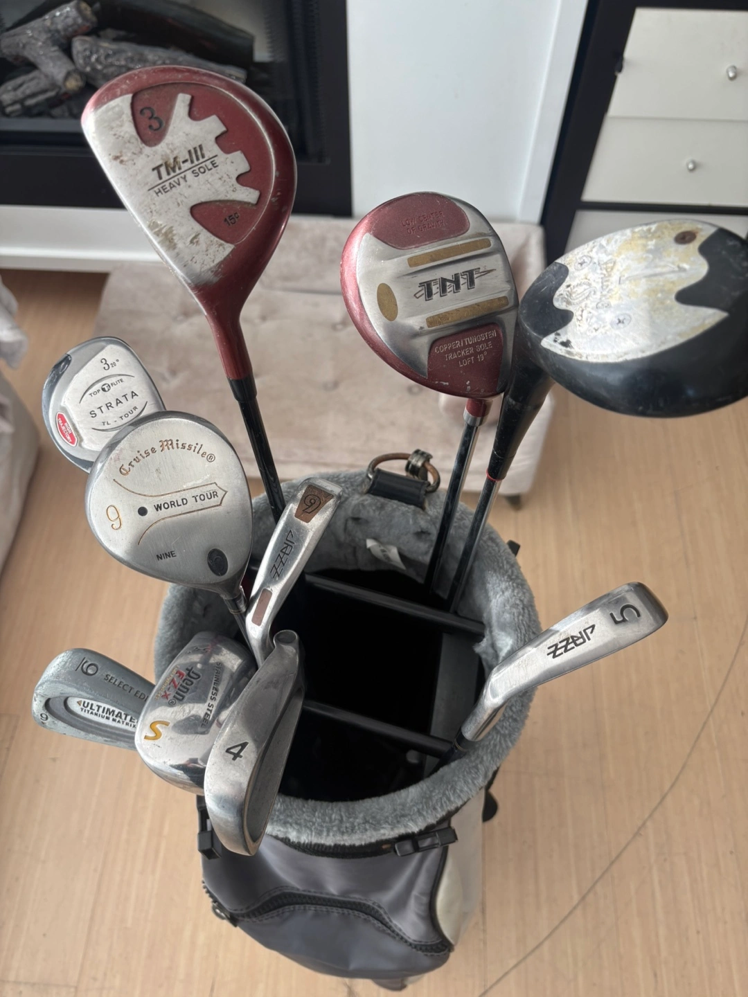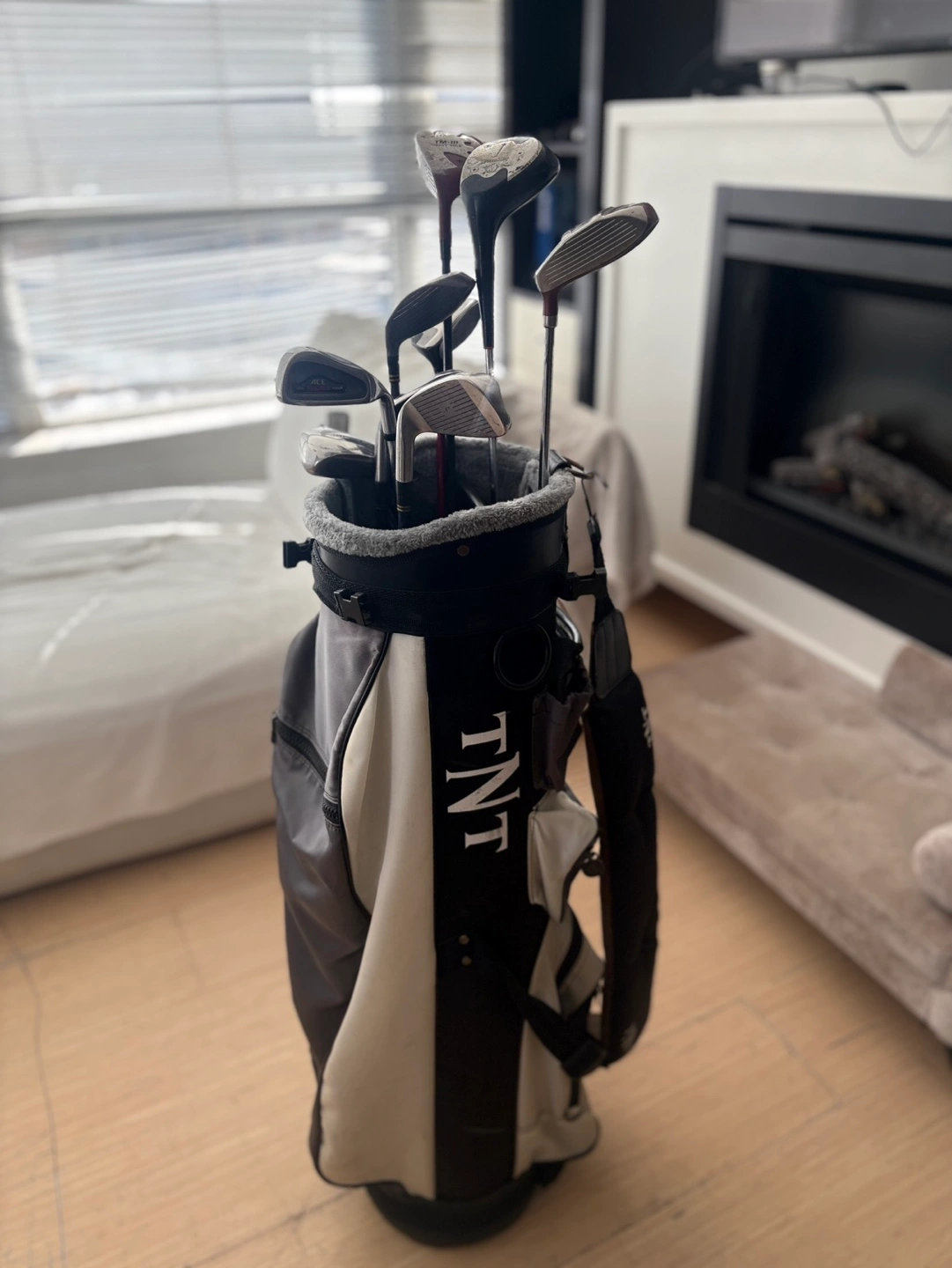57Complete golf club set. Includes irons and golf bag. Good condition, some wear and tear. Clubs show signs of use.